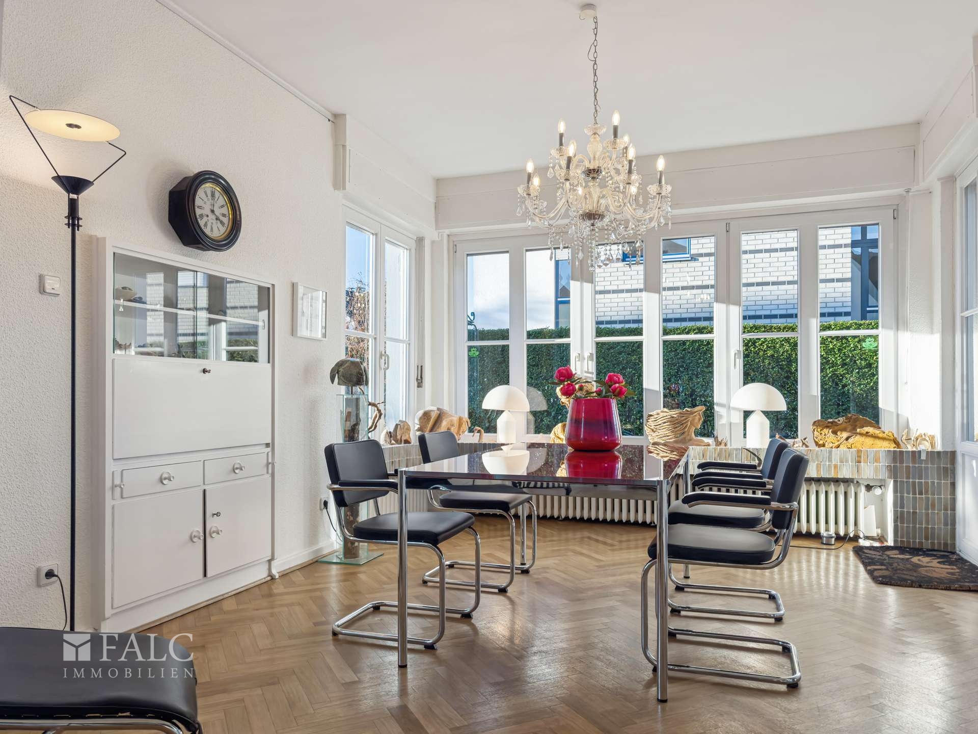 - Erdgeschoss mit Wohnbereich, Verandazimmer, Küche, Gäste-WCs und separatem Praxis- bzw. Bürotrakt mit 4 Zimmern & Duschbad