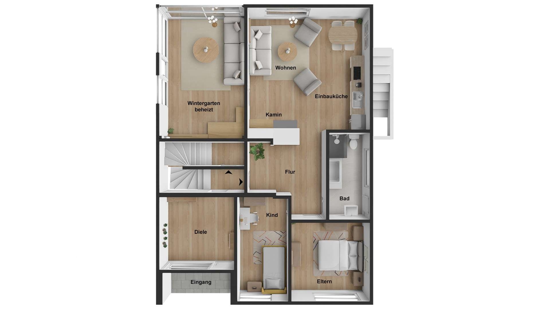 Beim Betreten dieser Wohnung empfängt Sie ein großzügiger Flur, der in die verschiedenen Räume führt. Das Herzstück ist das lichtdurchflutete Wohnzimmer mit seinem beeindruckenden Kamin, der nicht nur an kalten Tagen für eine wohlige Atmosphäre sorgt, sondern auch ein echter Hingucker ist. Große Fenster lassen viel Tageslicht herein und schaffen eine freundliche Wohnatmosphäre. Von hier aus gelangen Sie in den angrenzenden Wintergarten, ein gemütlicher Ort für entspannte Stunden mit Blick in den liebevoll angelegten Garten.