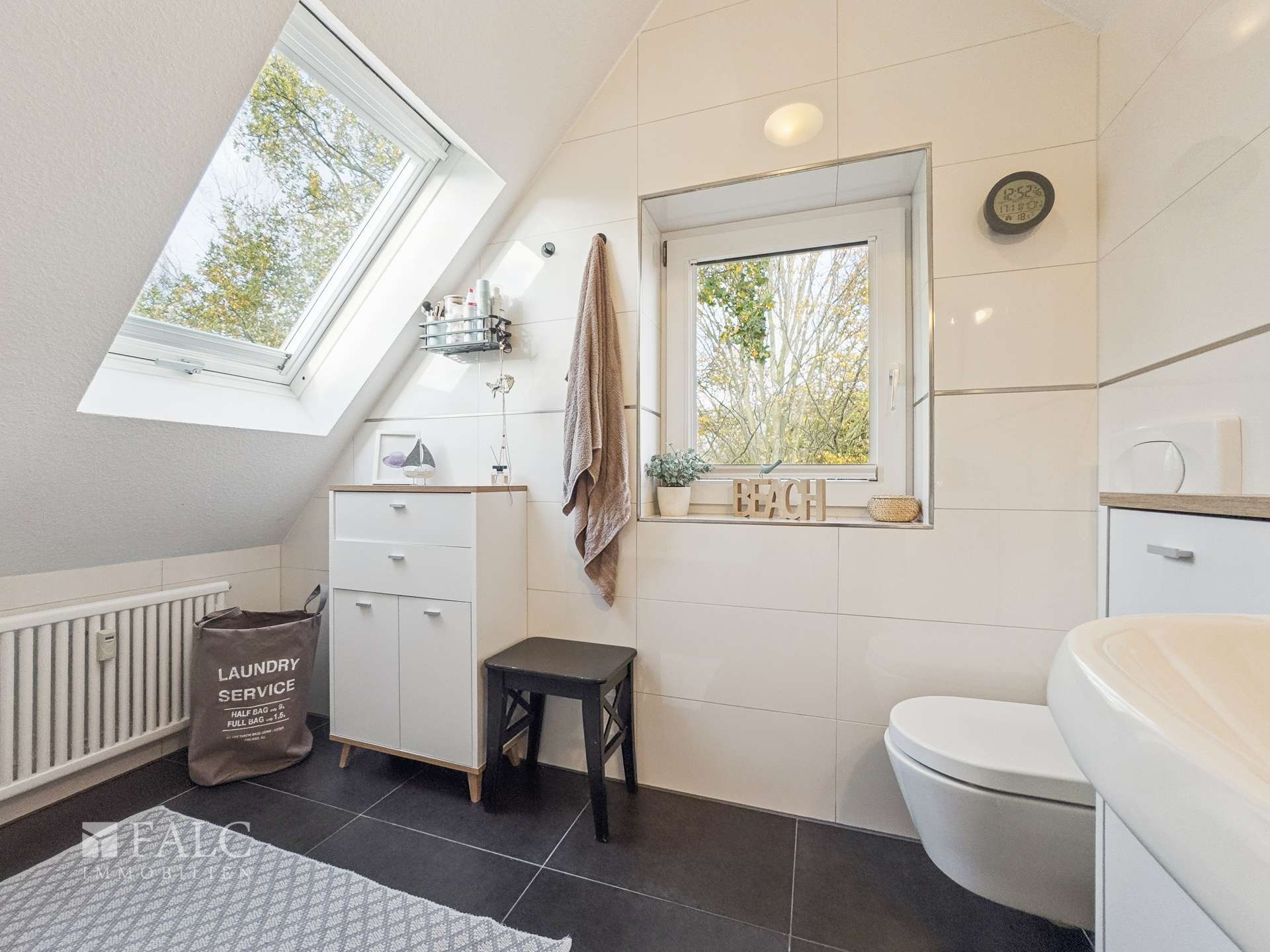 Das zweite Badezimmer auf dieser Ebene ist mit zwei Fenstern ausgestattet, die den Blick freigeben in die Baumwipfel – und an manchen Tagen auf spielende Eichhörnchen. Die Ausstattung ist modern, mit Badewanne und Platz für den entspannten Start oder Ausklang des Tages. Zwei moderne Klimageräte sorgen auch im Hochsommer für angenehme Temperaturen – sie können bei Bedarf auch heizen und unterstützen die Zentralheizung.