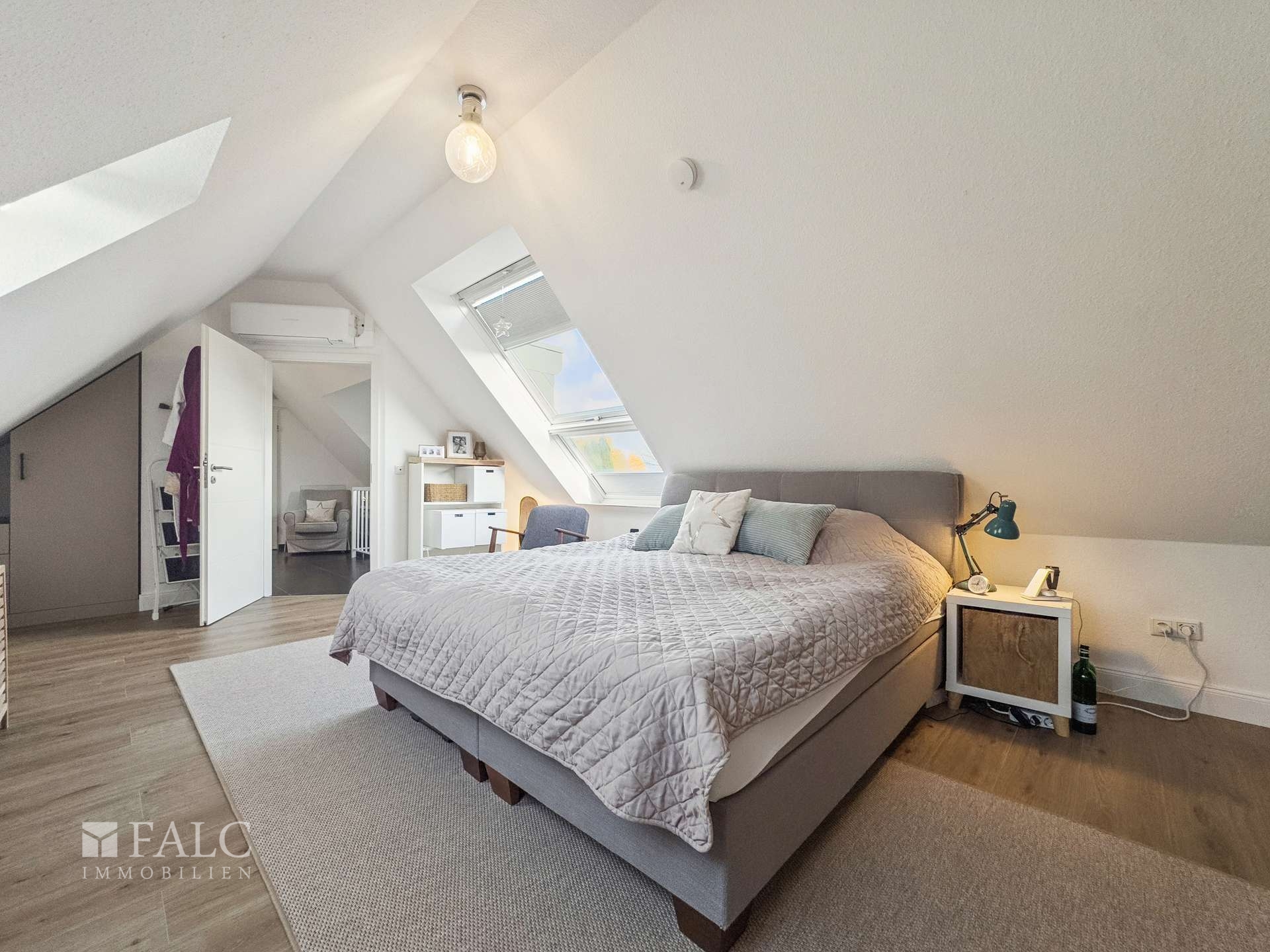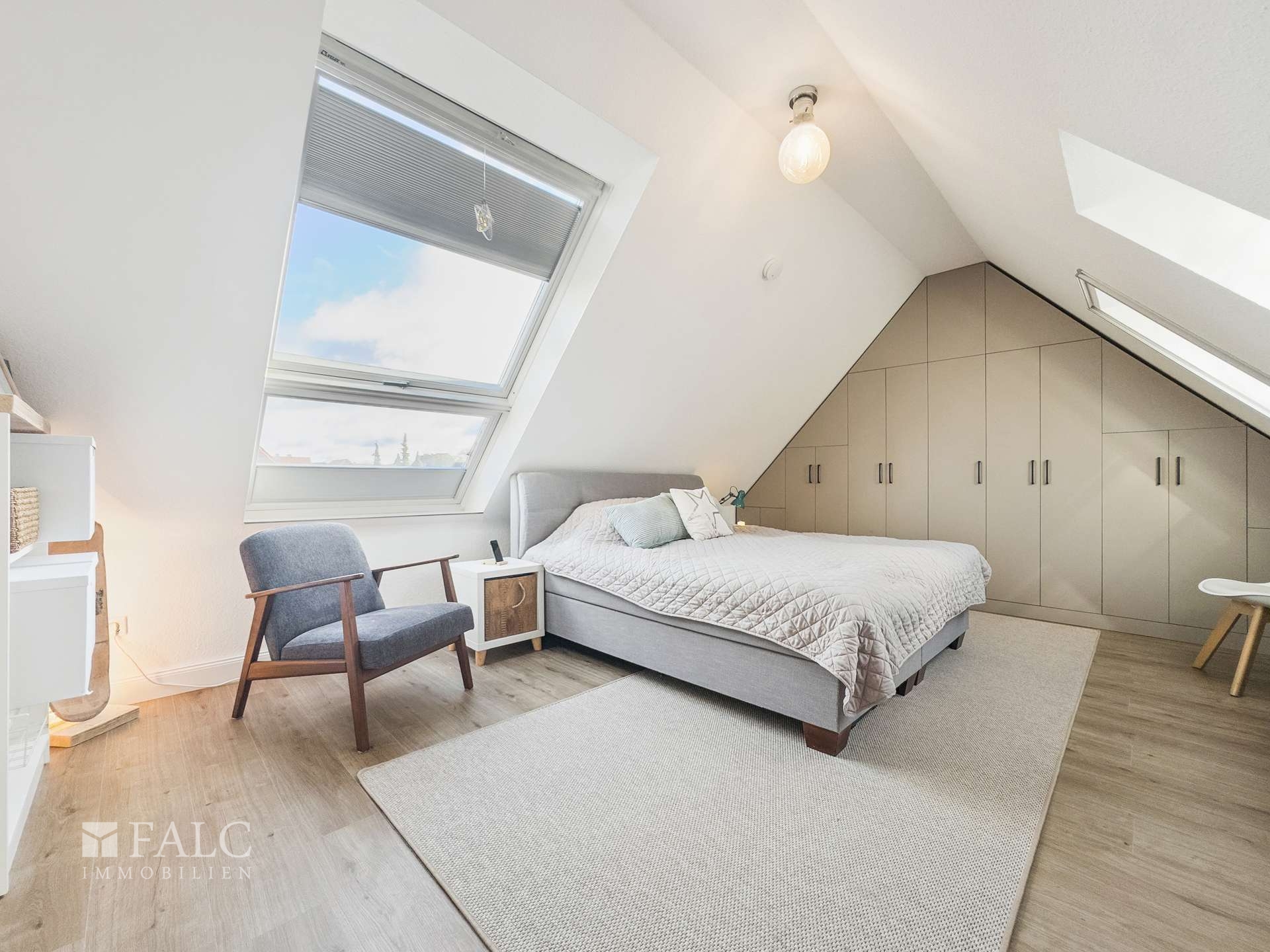 Über eine gut integrierte Treppe gelangt man in den ausgebauten Spitzboden – eine zweite Wohnebene mit viel Licht, Höhe und Raumgefühl. Der offene Flur wird aktuell als Homeoffice genutzt. Das Schlafzimmer auf dieser Ebene ist großzügig, die Dachschrägen wurden mit maßgefertigten Einbauten genutzt, ohne den Raum einzuengen. Auch hier fällt das Licht durch große Dachfenster und bringt Weite in den Raum.