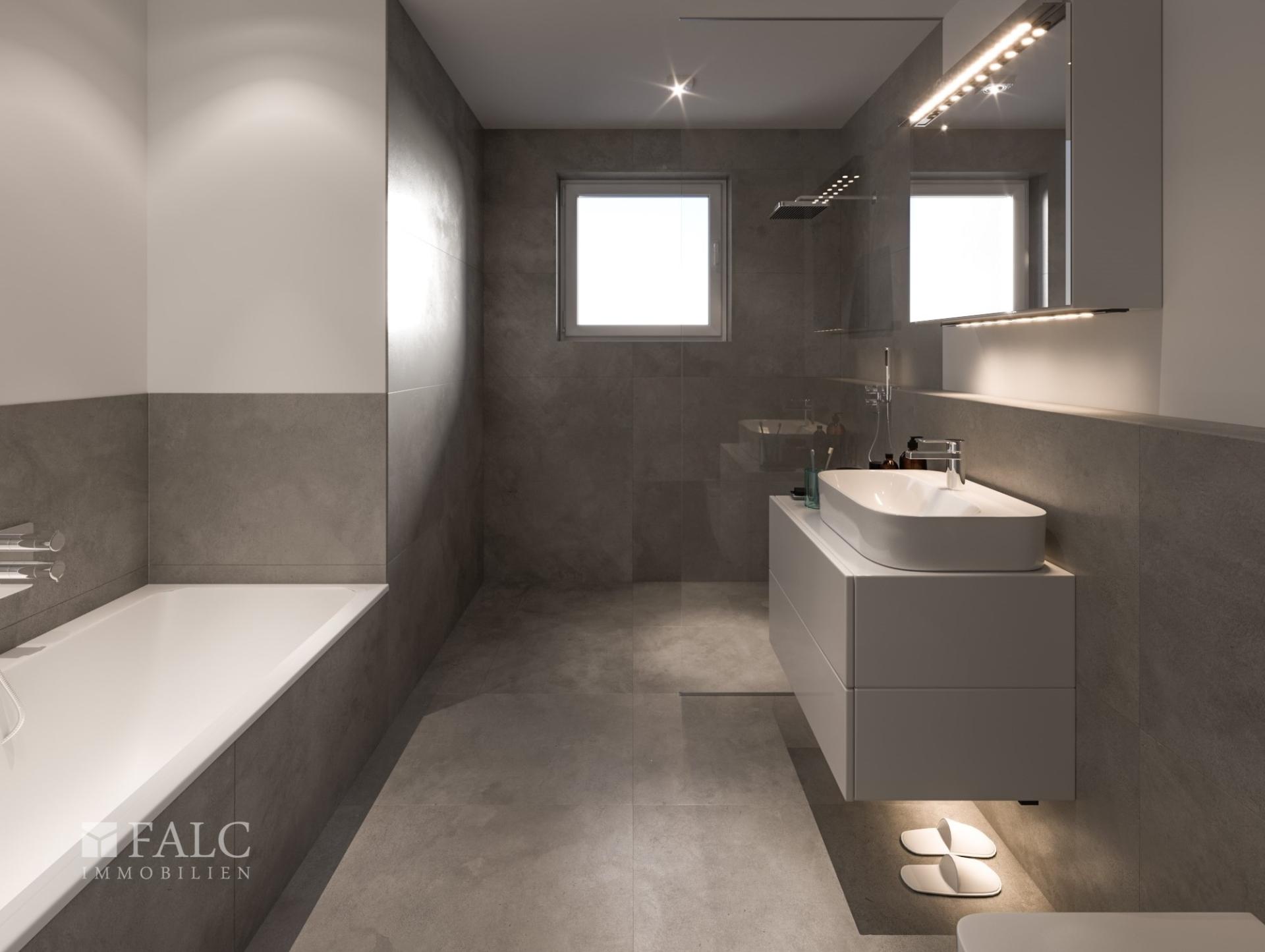Das Badezimmer präsentiert sich als elegante Wohlfühloase mit bodengleicher Dusche inklusive Glasabtrennung, Badewanne, Waschtisch mit Unterschrank sowie WC von Villeroy & Boch. Hochwertige Armaturen von Grohe setzen zusätzliche Akzente. Die vollständige Sanitärausstattung ist im Kaufpreis enthalten.