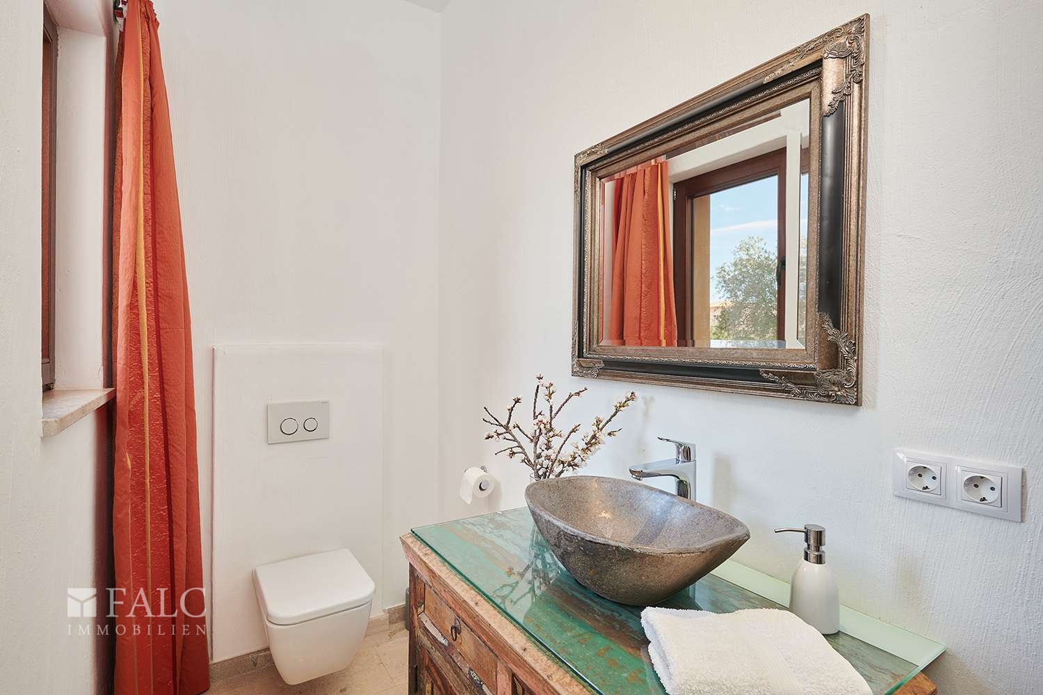 Auch im Außenbereich zeigt sich die Finca von ihrer besten Seite. Der üppig angelegte Palmengarten mit traumhaftem Panoramablick öffnet sich zu einem großzügigen Poolbereich, der zu entspannten Stunden in der Sonne oder sportlichen Aktivitäten auf dem angrenzenden Volleyballfeld einlädt. Die überdachte Terrasse wird schnell zum Lieblingsplatz – mit Blick auf das glitzernde Meer und die Berge des Llevante-Gebirges. In der stilvollen Sommerküche im separaten Gebäude genießen Sie laue Abende unter freiem Himmel, während Garten, Pool und die elegante Zufahrt in sanftem Licht erstrahlen.
