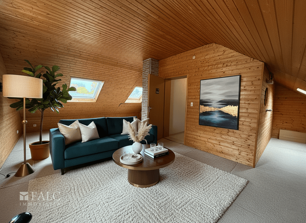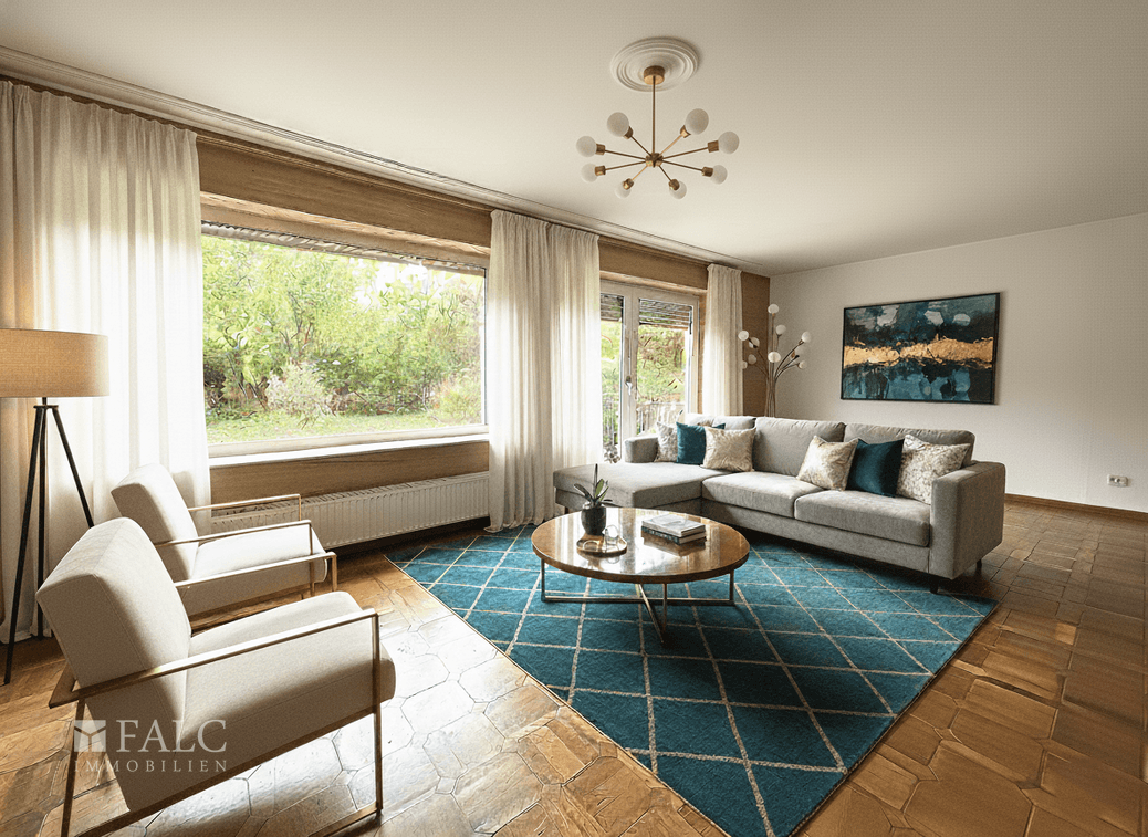 Angrenzend befindet sich der offene Wohnbereich, der viel Raum für gemütliche Abende und gesellige Zusammenkünfte bietet. Ein besonderes Highlight ist der offene Kamin, der an kühleren Tagen für wohlige Wärme und eine behagliche Atmosphäre sorgt. Die großen Fenster lassen viel Tageslicht herein und bieten einen schönen Blick auf den gepflegten Garten.