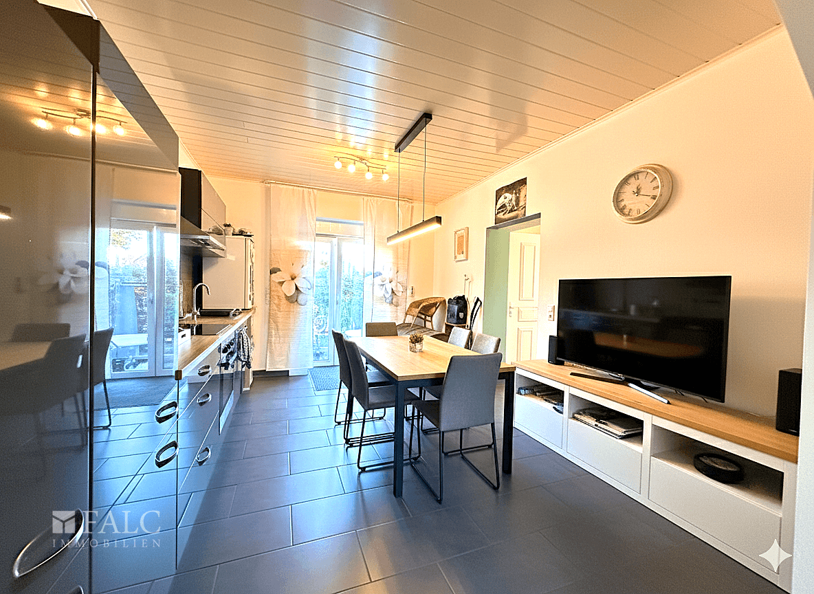 Rechts vom Flur liegt die Küche, die genügend Platz für einen Essbereich bietet hier können gemütliche Mahlzeiten mit der Familie stattfinden. Von der Küche aus gelangen Sie auf der rechten Seite in das Wohnzimmer, das durch seine angenehme Größe und Helligkeit zum Entspannen und Verweilen einlädt. Auf der linken Seite der Küche befindet sich der Zugang zum Garten, ein Rückzugsort für die ganze Familie, perfekt für Kinder zum Spielen oder für gemütliche Stunden im Freien.