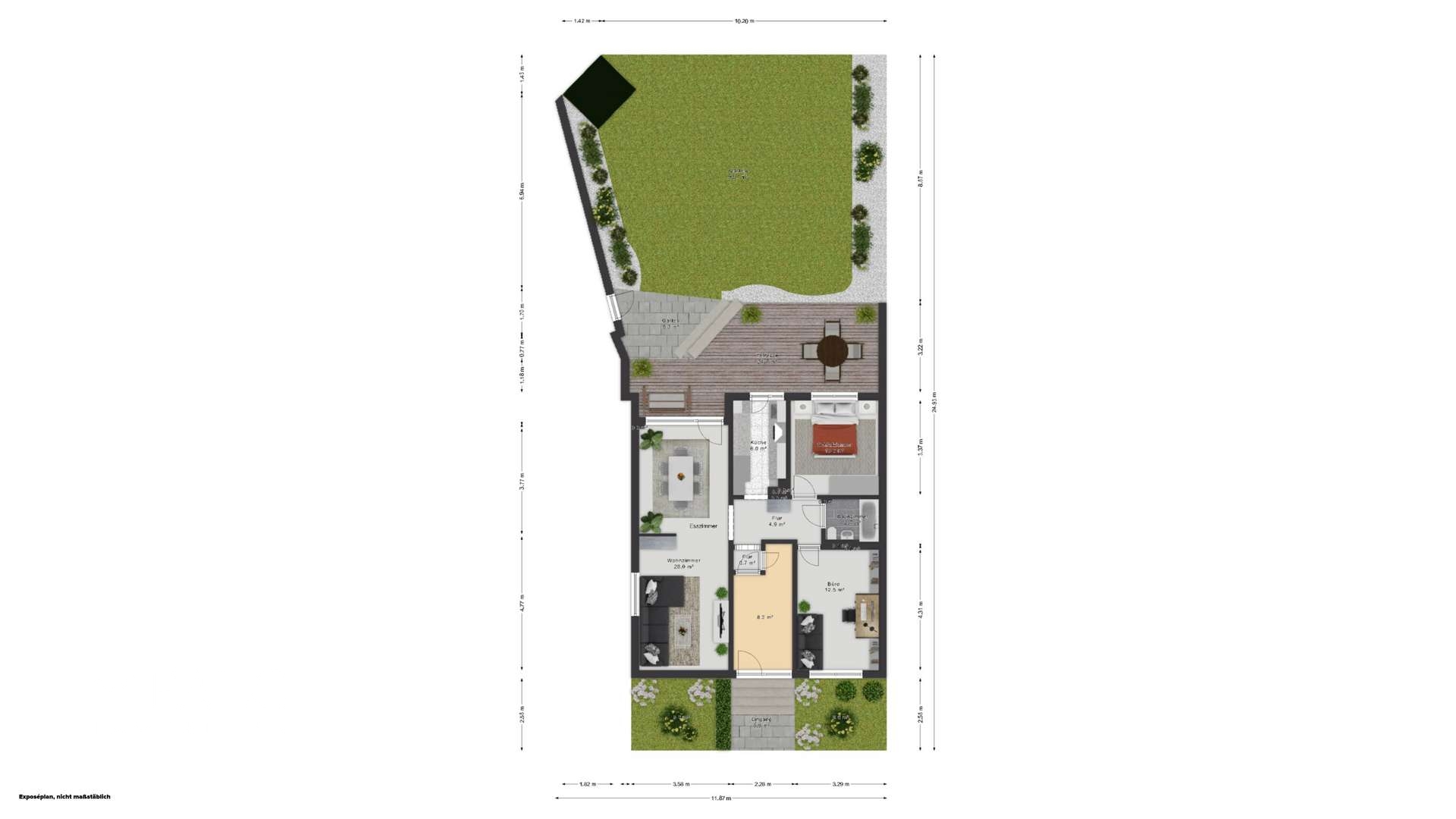 Ein weiterer großer Pluspunkt ist die großzügige Terrasse, die sowohl vom Wohnzimmer als auch von der Küche aus zugänglich ist. Sie bildet die perfekte Verbindung zwischen Innen- und Außenbereich und führt direkt in den weitläufigen Garten.