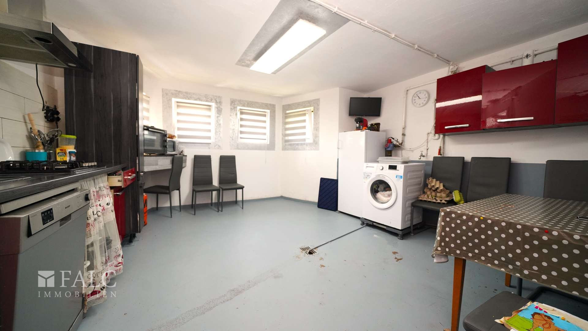 Komplementiert wird das Angebot durch ein vollständig ausgebauten Keller, der weitere Stauräume bietet, sowie ein Abstellraum für Fahrräder und weitere Geräte ermöglicht. Dieser ist durch eine doppelte Tür von der Straße zu erreichen. Genießen Sie die Vorteile einer Waschküche, wo Sie die Wäsche auch mal Wäsche sein lassen können, wenn Gäste Sie überraschen.