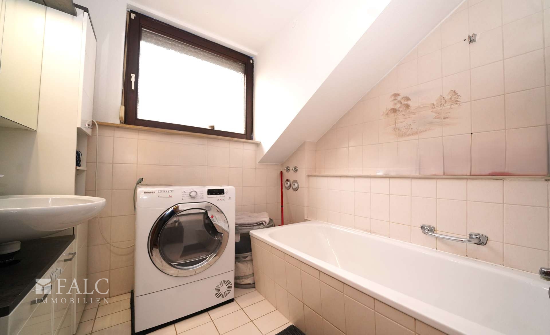 Das großzügige Badezimmer verfügt über ein Waschbecken, sowie eine Badewanne und bietet ausreichend Platz für eine Waschmaschine.