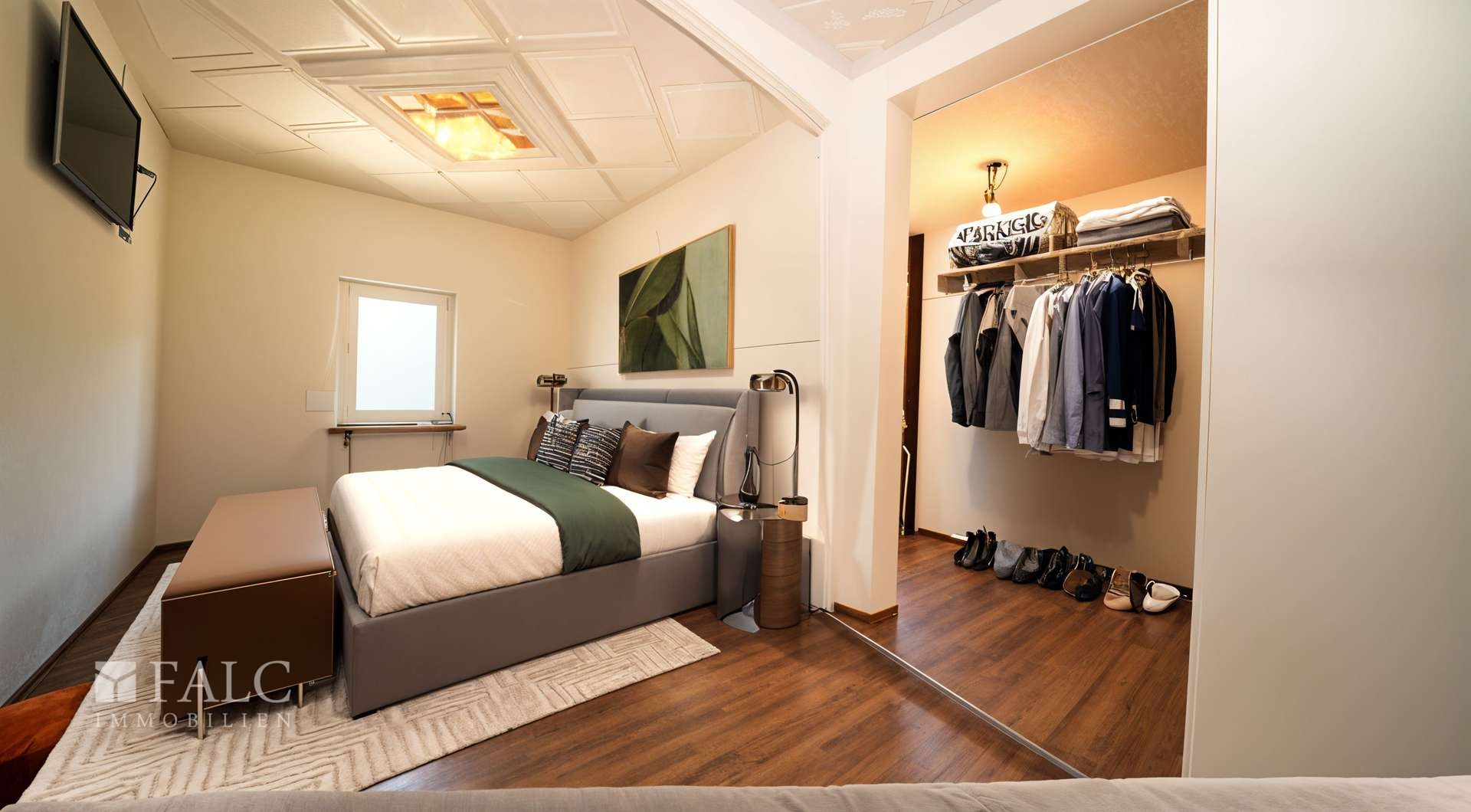 Zurück im Wohnbereich führt eine Treppe ins Obergeschoss. Oben angekommen, eröffnet sich ein heller Flur, der alle weiteren Räume erschließt. Drei großzügige Zimmer mit etwa 18 bis 22 m² stehen zur Verfügung – flexibel nutzbar als Schlafzimmer, Kinderzimmer oder Arbeitszimmer. Besonders hervorzuheben ist ein Raum mit integrierter begehbarer Ankleide, ideal als Elternschlafzimmer. Jegliche Räume sind mit stilvollen Parkettböden ausgestattet.