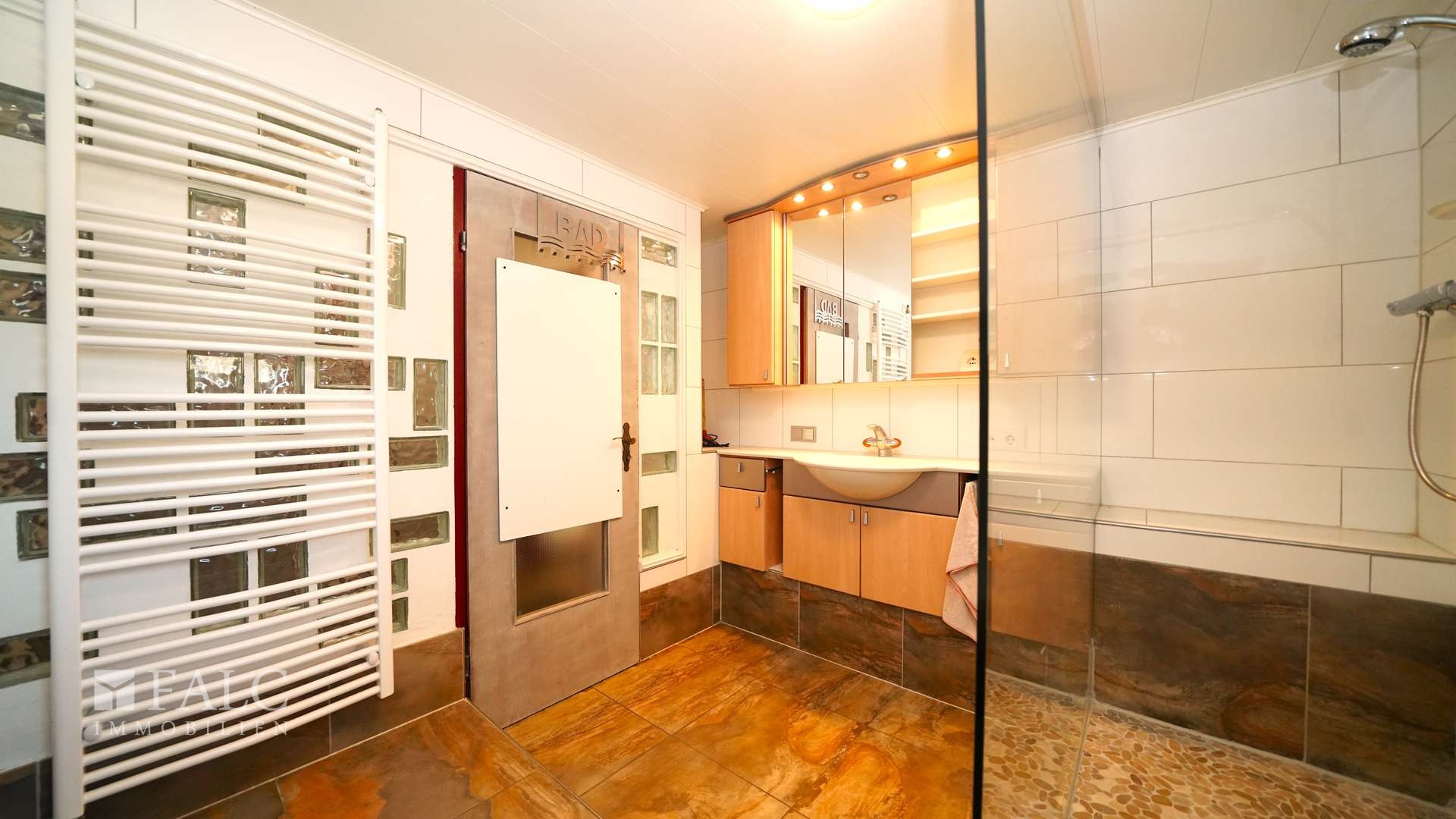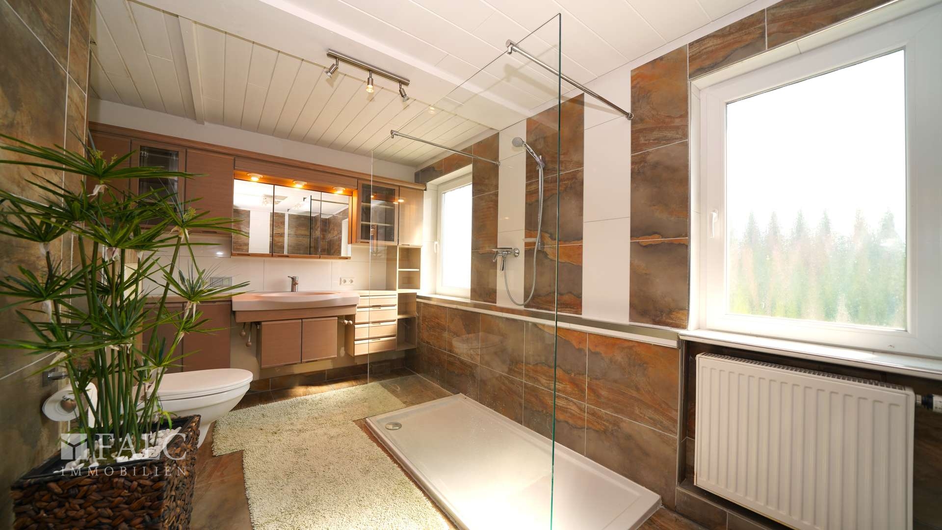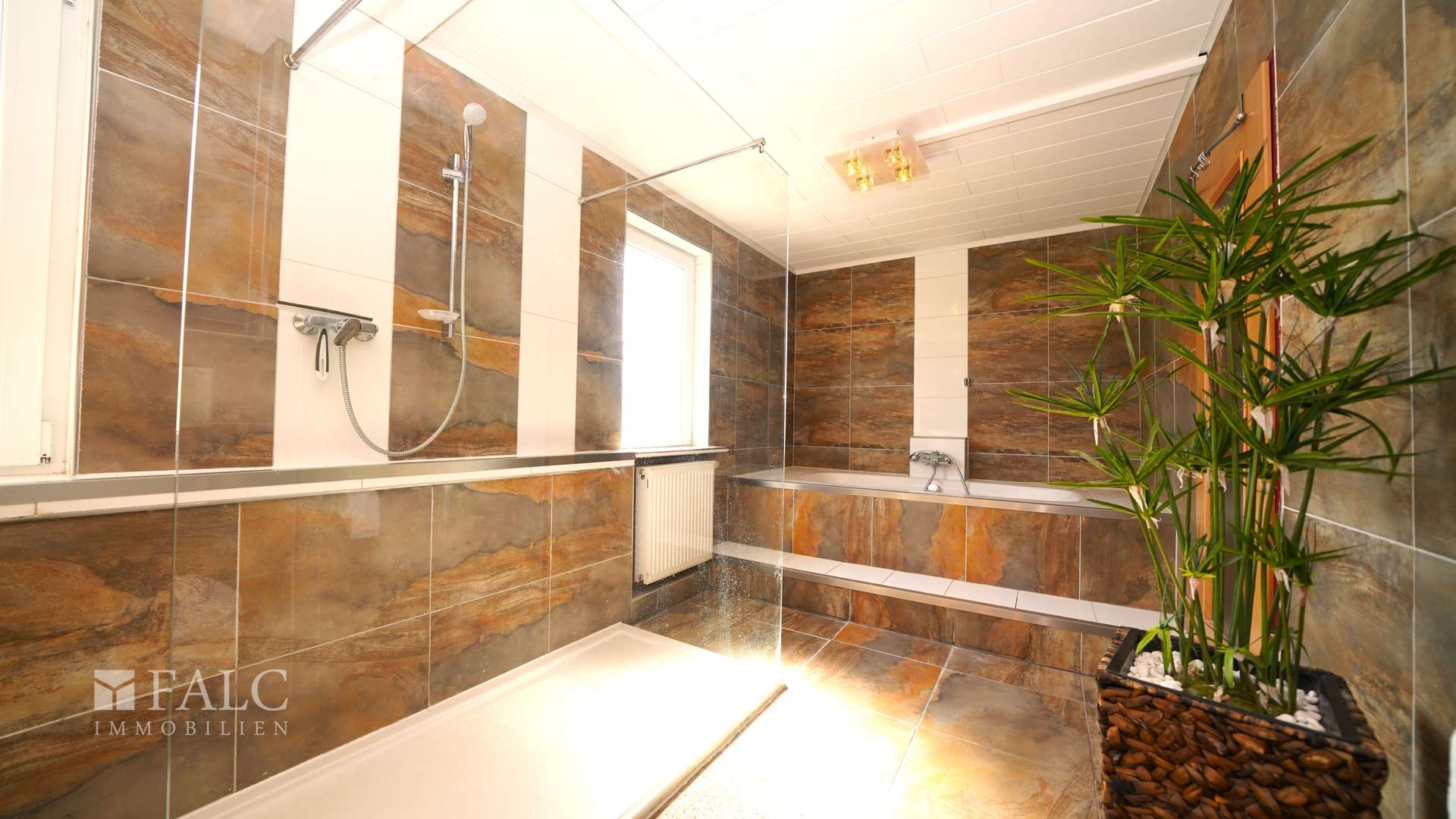 Ein weiteres, gut ausgestattetes Tageslichtbad befindet sich ebenfalls auf dieser Etage. Es bietet sowohl Dusche als auch Badewanne sowie ein stilvolles Waschbecken – ideal für den morgendlichen Start in den Tag oder entspannte Abendstunden.
