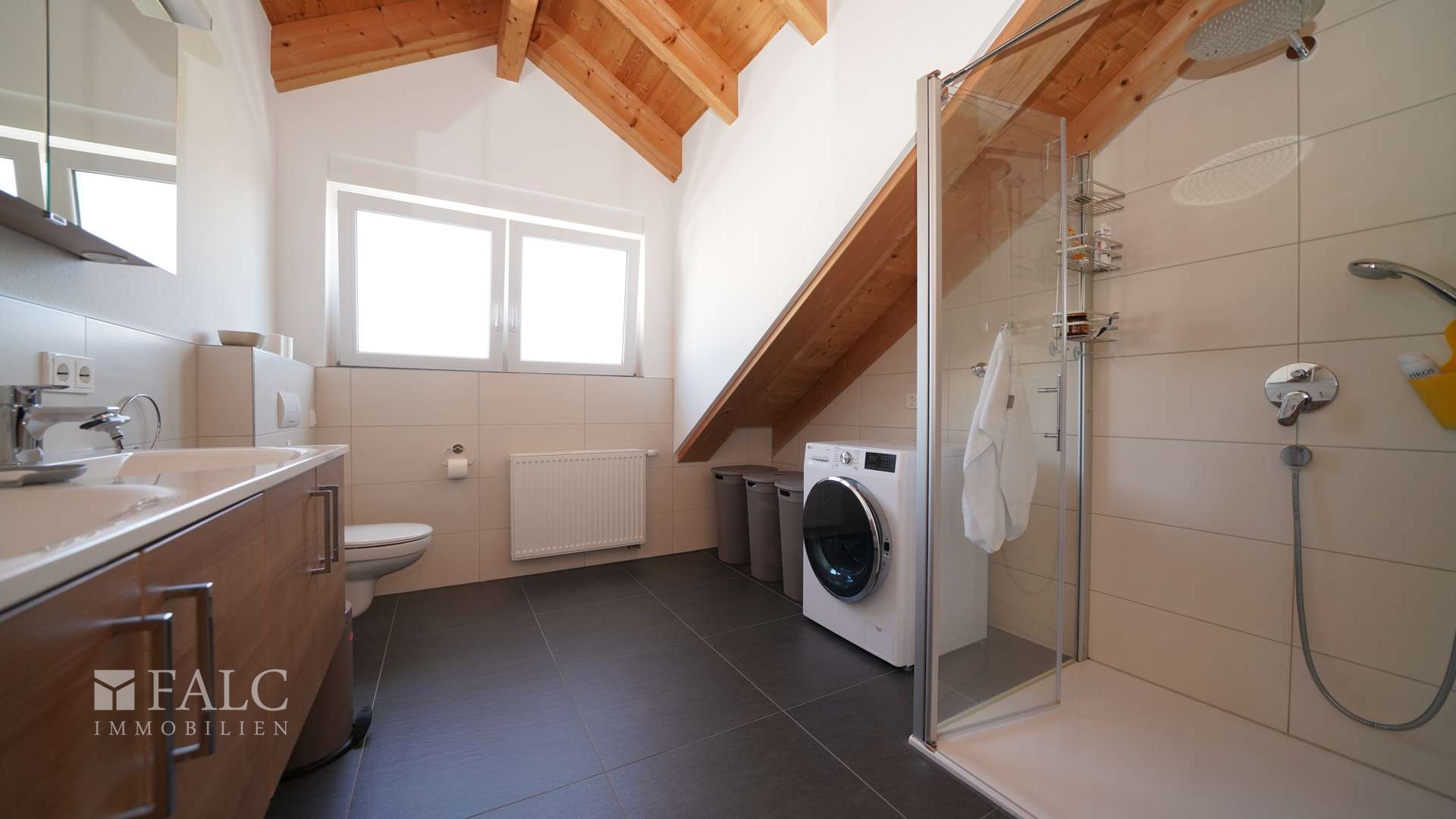 Rechts vom Eingangsbereich befinden sich die weiteren Räume der Wohnung. Das moderne Tageslichtbad in Holzoptik verfügt über Dusche, WC, Waschbecken sowie einem Waschmaschinenanschluss – ein echtes Plus im Alltag. Gegenüber befindet sich ein separates Gäste-WC, was insbesondere bei Besuch zusätzlichen Komfort bietet. Ein praktischer Abstellraum rundet den funktionalen Bereich ab und bietet Stauraum für Vorräte, Haushaltsgeräte oder Reinigungsmittel.