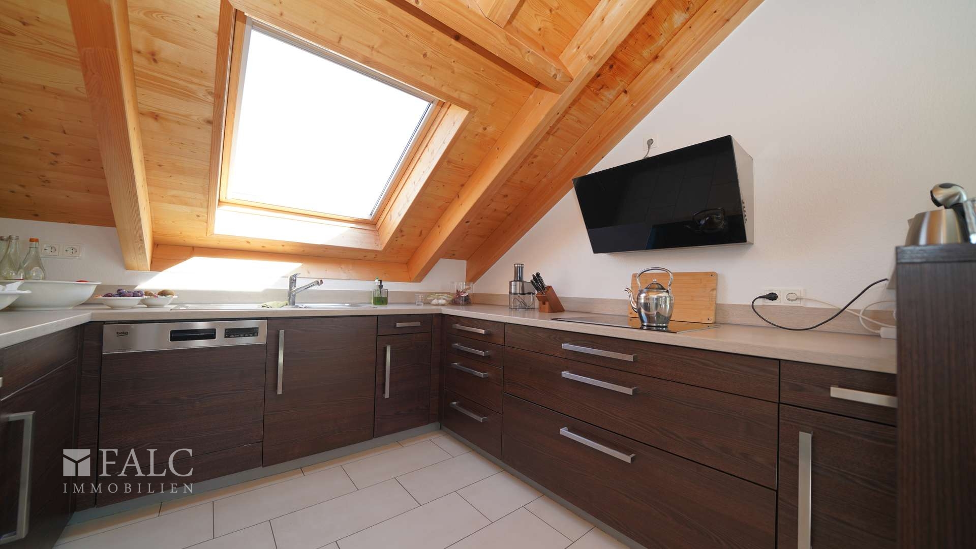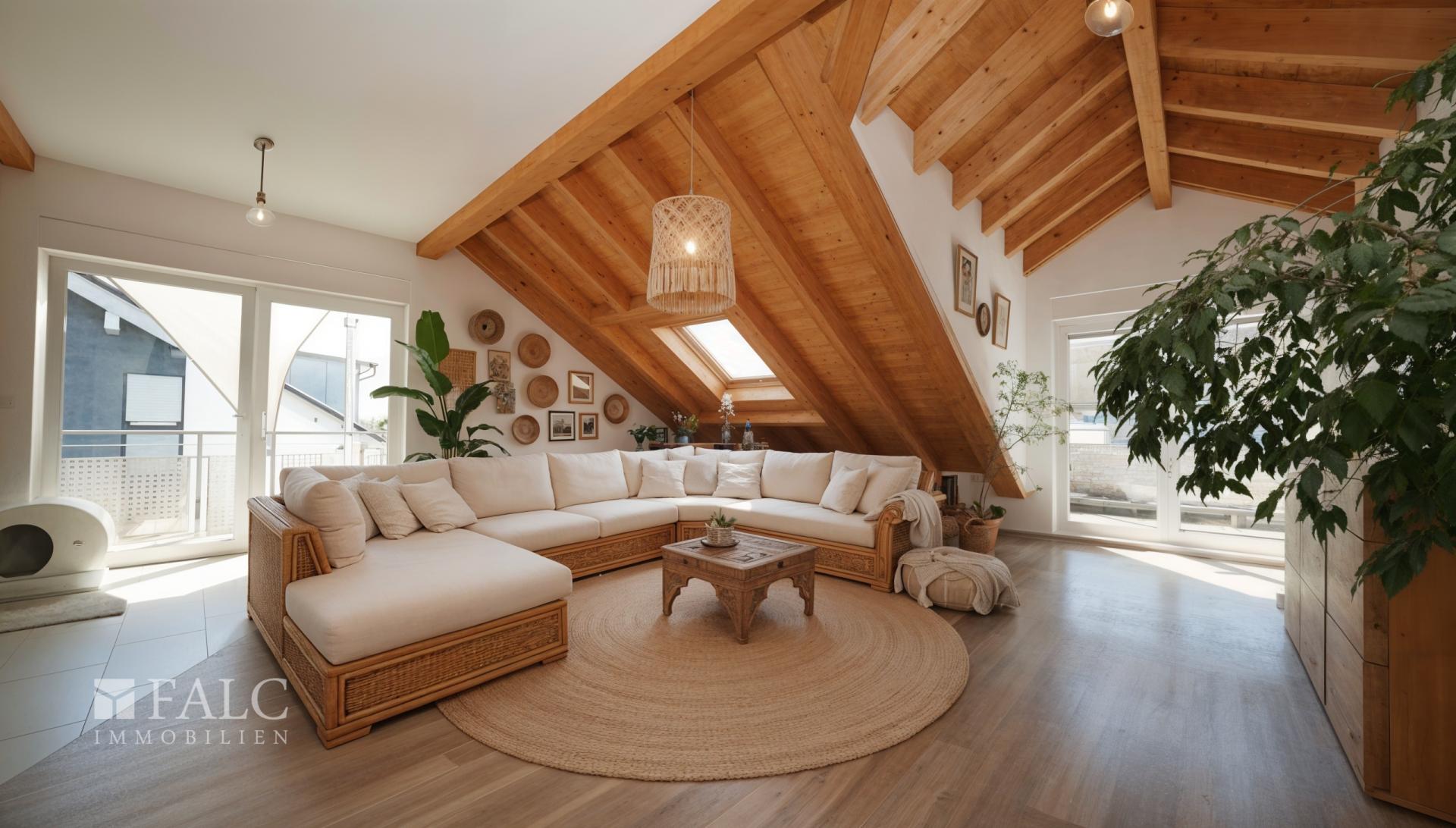 Über das Treppenhaus erreichen Sie das Dachgeschoss, in dem sich die Wohnung befindet. Bereits beim Eintreten wird man von einem großzügigen, lichtdurchfluteten Wohnbereich empfangen. Auf rund 40 m² bietet dieser Raum ausreichend Platz für eine gemütliche Wohnlandschaft, einen großen Esstisch sowie eine offene, moderne Einbauküche, die im Kaufpreis inbegriffen ist. Die großzügige Gestaltung verleiht dem Raum eine angenehme Offenheit und lädt zum Verweilen ein.