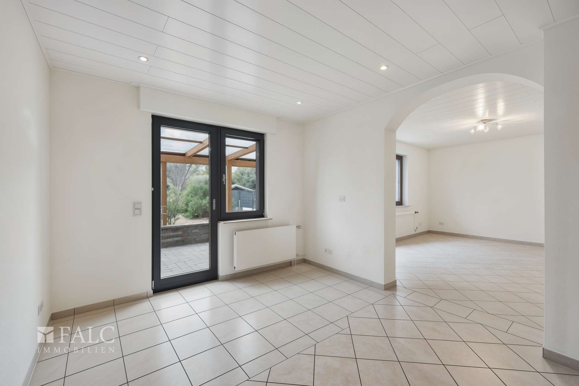 Die Küche und das Esszimmer gehen fließend ineinander über und bieten einen direkten Zugang zur großen Terrasse und dem weitläufigen Garten – ideal für Familienleben und gesellige Stunden im Freien. Das Wohnzimmer liegt gegenüber, ist ebenfalls offen und sehr großzügig gestaltet. Abgerundet wird diese Ebene durch einen Abstellraum sowie ein Badezimmer.