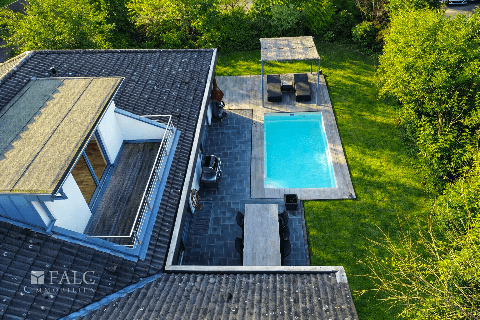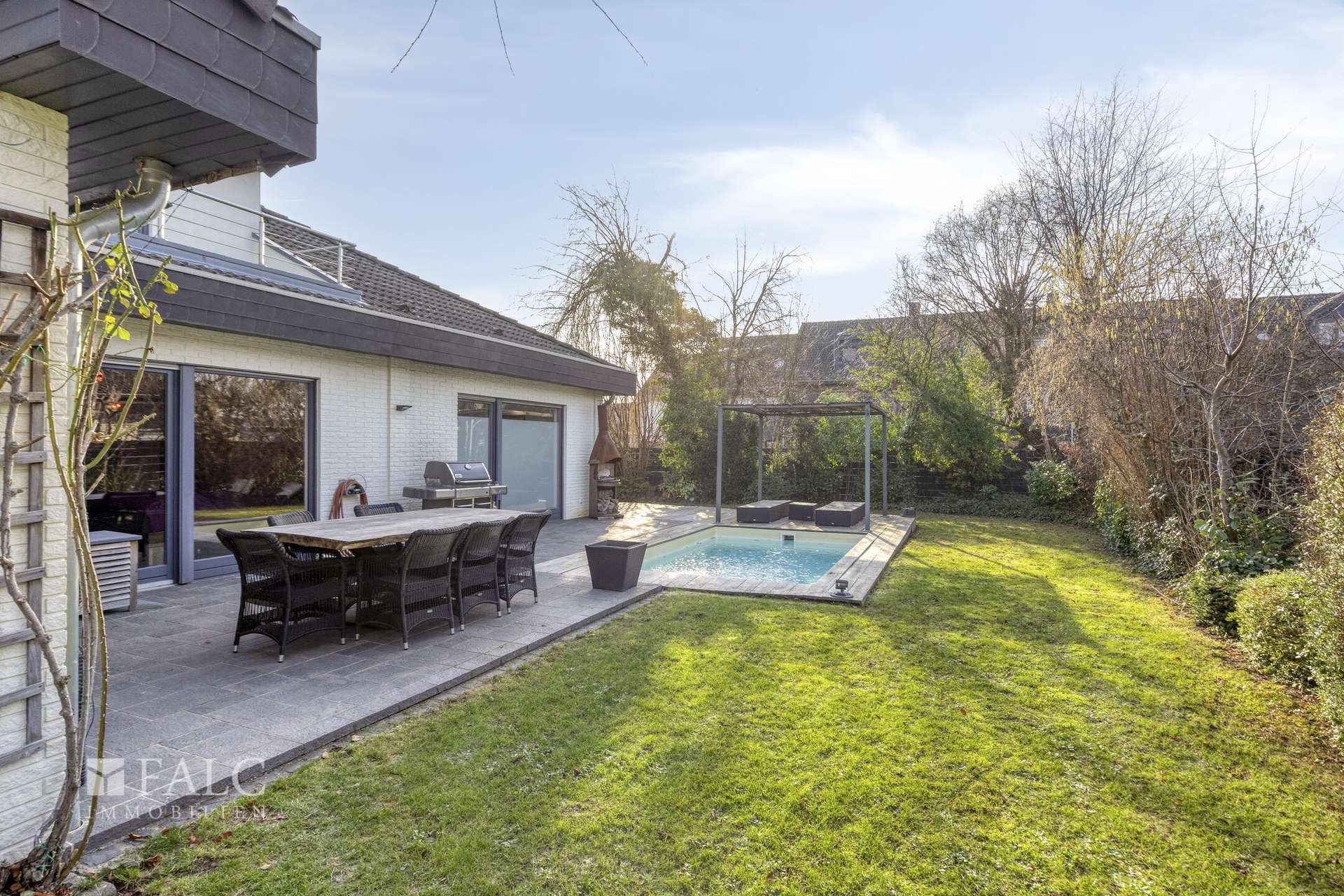Der liebevoll gestaltete Garten mit großzügiger Terrasse, beheiztem Pool und einer stilvollen Lounge-Area mit gemütlichen Liegen schafft eine Oase der Entspannung. Hier genießen Sie Ruhe, Atmosphäre und echtes Urlaubsgefühl im eigenen Zuhause.