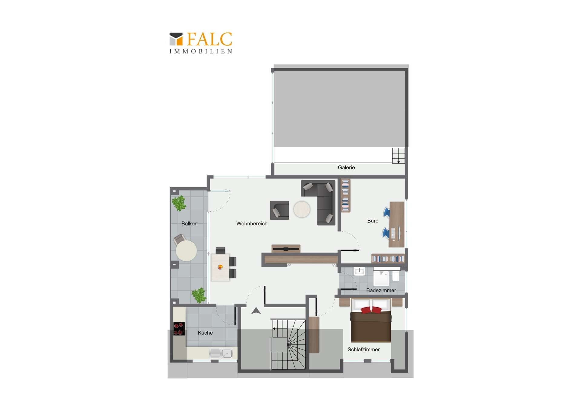 Vom Wohnzimmer führt eine Treppe hinauf zur Galerie, die sich ideal als zusätzlicher Rückzugsort eignet.