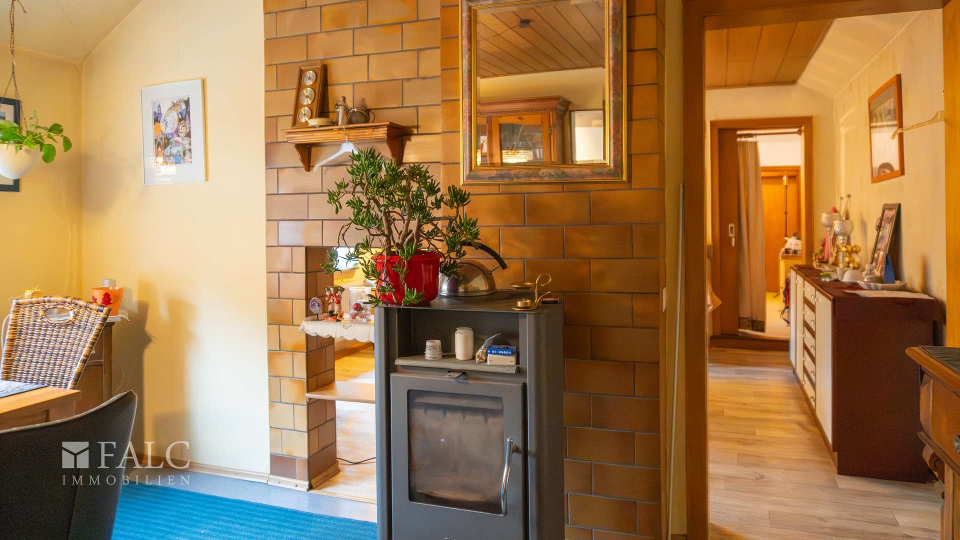 Es erwartet Sie ein großzügiger Wohnbereich, der durch seine offene Gestaltung überzeugt. Ein Highlight ist die Kaminecke im Esszimmer, die an kühlen Abenden für wohlige Wärme sorgt.