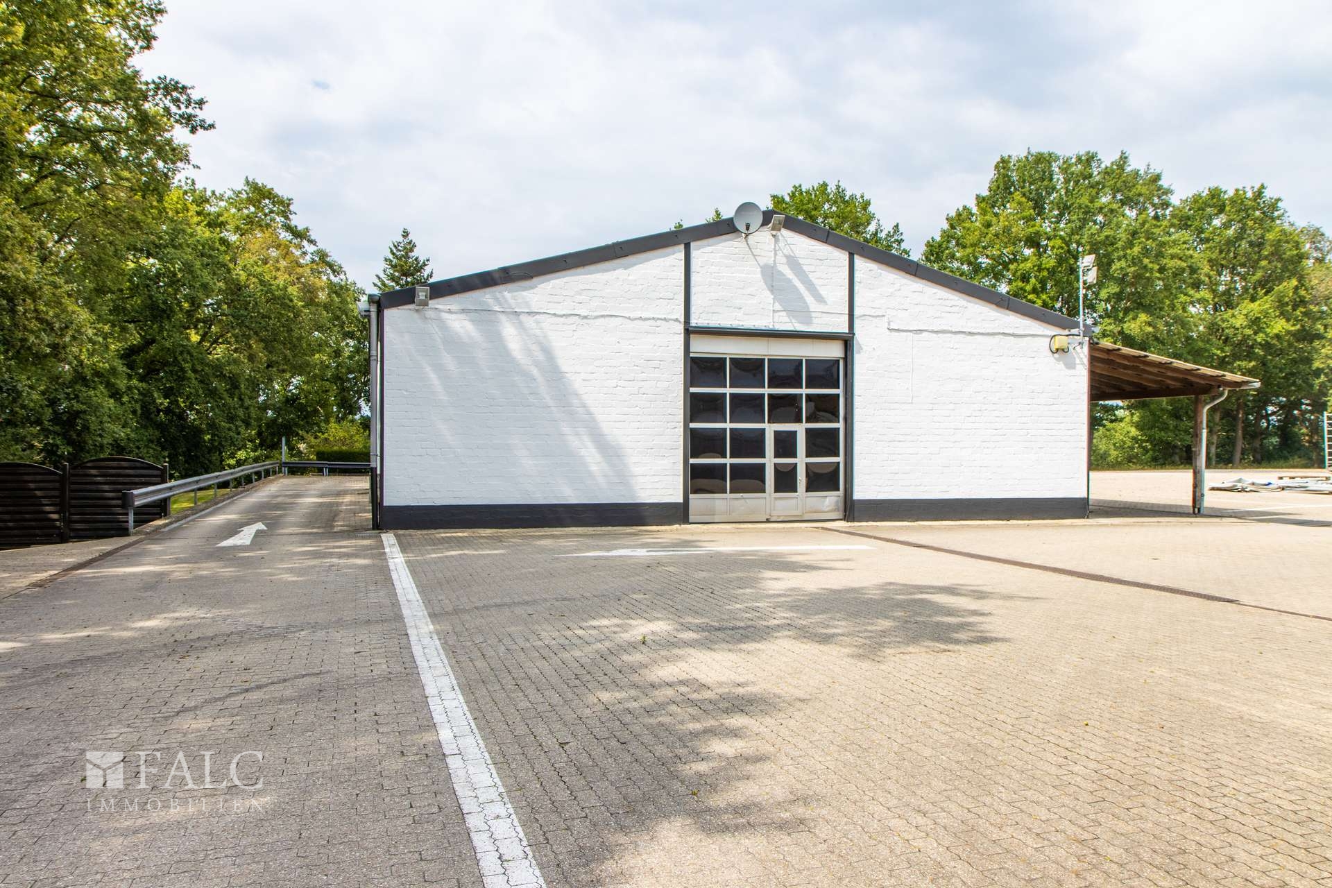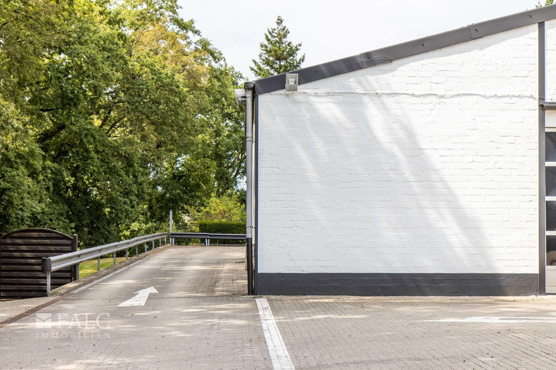 Die Zufahrt zu dem Gebäude ist mit einem großen Metalltor abgesperrt. Durch diese Zufahrt gelangt man sowohl zur Lagerhalle als auch auf die große Parkplatzfläche, die sich auf einem insgesamt ca. 4.850 m² großen Grundstück befindet.