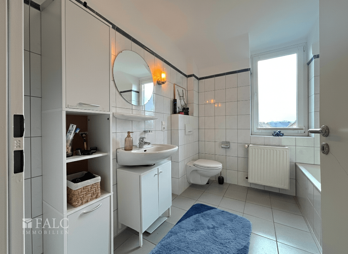 Sie betreten die Wohnung über den Flur, von dem alle Bereiche bequem erreichbar sind, ohne lange Wege. Direkt angrenzend liegt das Tageslicht-Badezimmer mit Wanne und Dusche. Es ist kompakt geschnitten und bietet Platz für die üblichen Sanitärobjekte sowie Stauraum für Handtücher und Pflegeartikel.