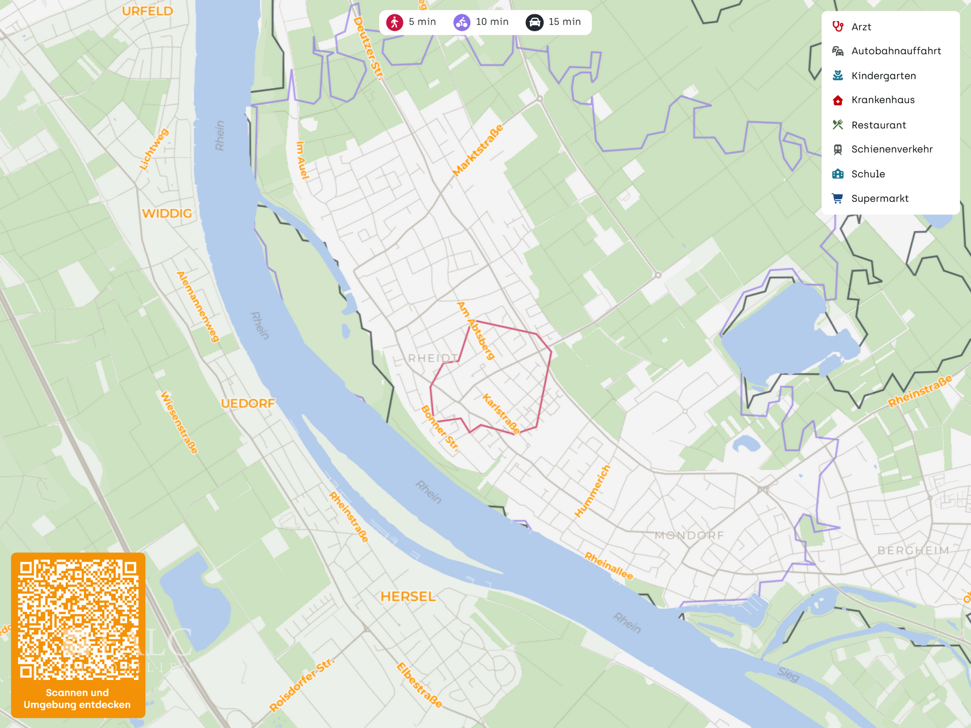Der Ortsteil Rheidt zählt zu den größten und traditionsreichsten Bereichen Niederkassels und erfreut sich aufgrund seines charmanten Ortsbildes und seiner ausgezeichneten Lebensqualität großer Beliebtheit. Geprägt von einer gewachsenen Nachbarschaft, gepflegten Wohngebieten und einer entspannten Atmosphäre, verbindet Rheidt dörfliche Ruhe mit der Nähe zur Rheinpromenade, die sich nur wenige Gehminuten entfernt erstreckt. Hier bieten sich ideale Bedingungen für Spaziergänge, Joggingrunden oder Radtouren entlang des Wassers. Der lebendige Ortskern verfügt über eine sehr gute Infrastruktur: Supermärkte, Bäckereien, Cafés, Restaurants, Apotheken, Ärzte und kleine Fachgeschäfte sind bequem erreichbar. Auch Familien profitieren von kurzen Wegen – mehrere Kindergärten, eine Grundschule sowie vielfältige Freizeit- und Sportangebote befinden sich direkt im Ort. Busverbindungen nach Köln, Bonn und in die umliegenden Stadtteile ergänzen die Mobilität und machen Rheidt zu einem idealen Wohnstandort für alle, die eine harmonische Mischung aus ruhigem Wohnen, naturnaher Umgebung und städtischer Erreichbarkeit suchen.