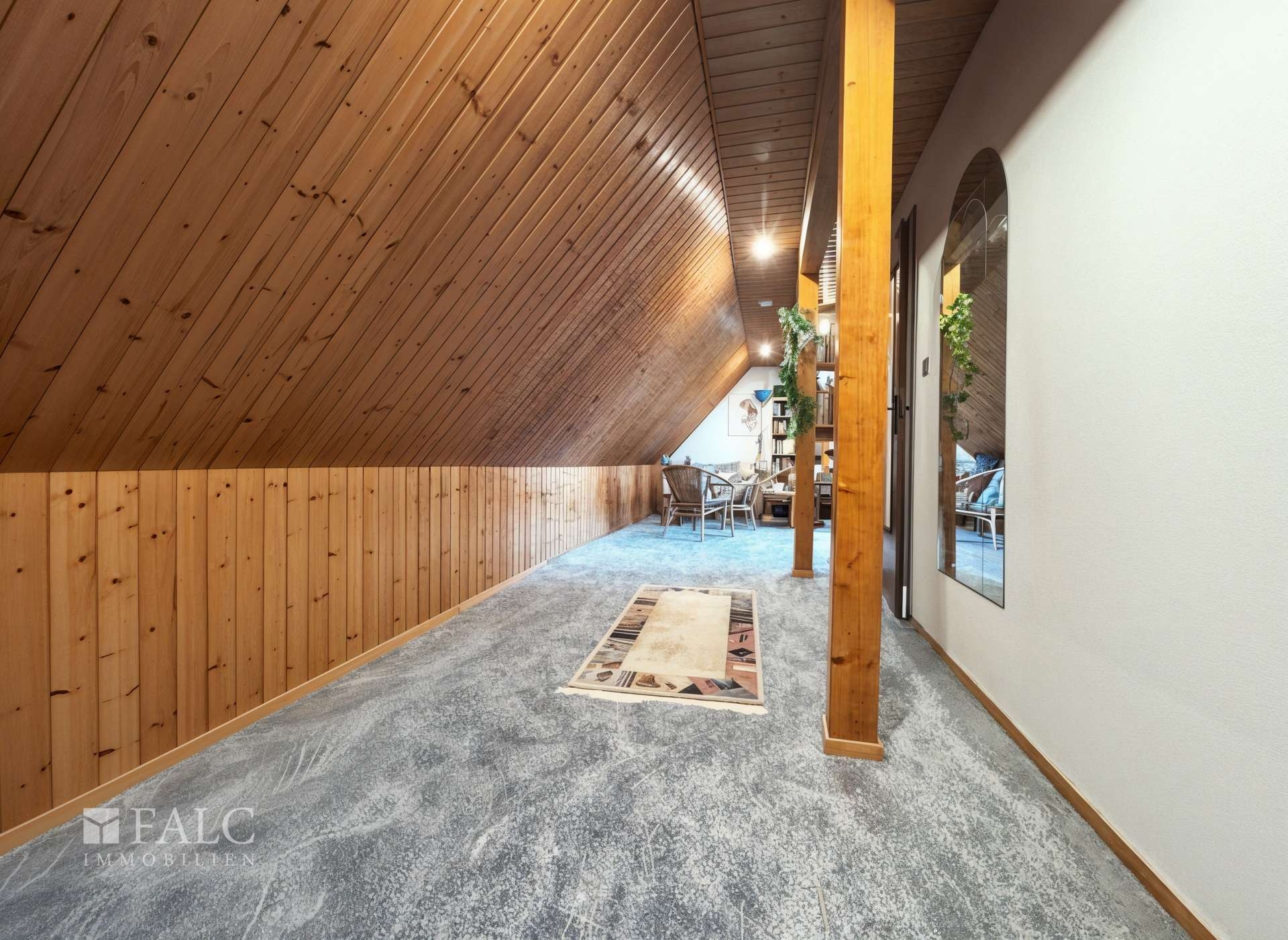 Im ersten Obergeschoss befinden sich drei Schlafzimmer sowie das großzügige Hauptbadezimmer, welches mit Dusche, Badewanne und einem Doppelwaschtisch ausgestattet ist. Von dieser Etage aus steht zudem ein Balkon zur Verfügung, der einen schönen Blick ins Grüne bietet. Über eine weitere Treppe gelangt man in den ausgebauten Dachboden, der zusätzlichen Wohnraum bietet und über ein eigenes Badezimmer mit Dusche und WC verfügt. Dieser Bereich eignet sich ideal als Gästezimmer, Jugendzimmer oder Homeoffice.
