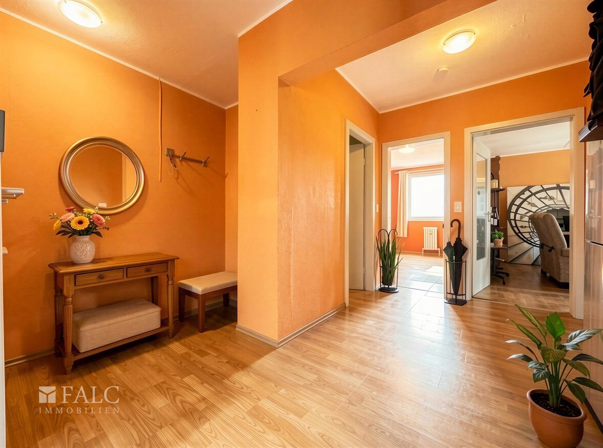 Beim Betreten der Wohnung gelangen Sie in einen großzügigen Flur, der ausreichend Platz für eine Garderobe sowie zusätzliche Stauraummöglichkeiten bietet und als zentrales Verbindungselement alle Räume erschließt. Direkt auf der rechten Seite befindet sich das Badezimmer. Angrenzend daran liegt das Schlafzimmer, das über einen direkten Zugang zum Balkon verfügt und somit einen angenehmen Rückzugsort mit zusätzlicher Frischluftanbindung bietet.