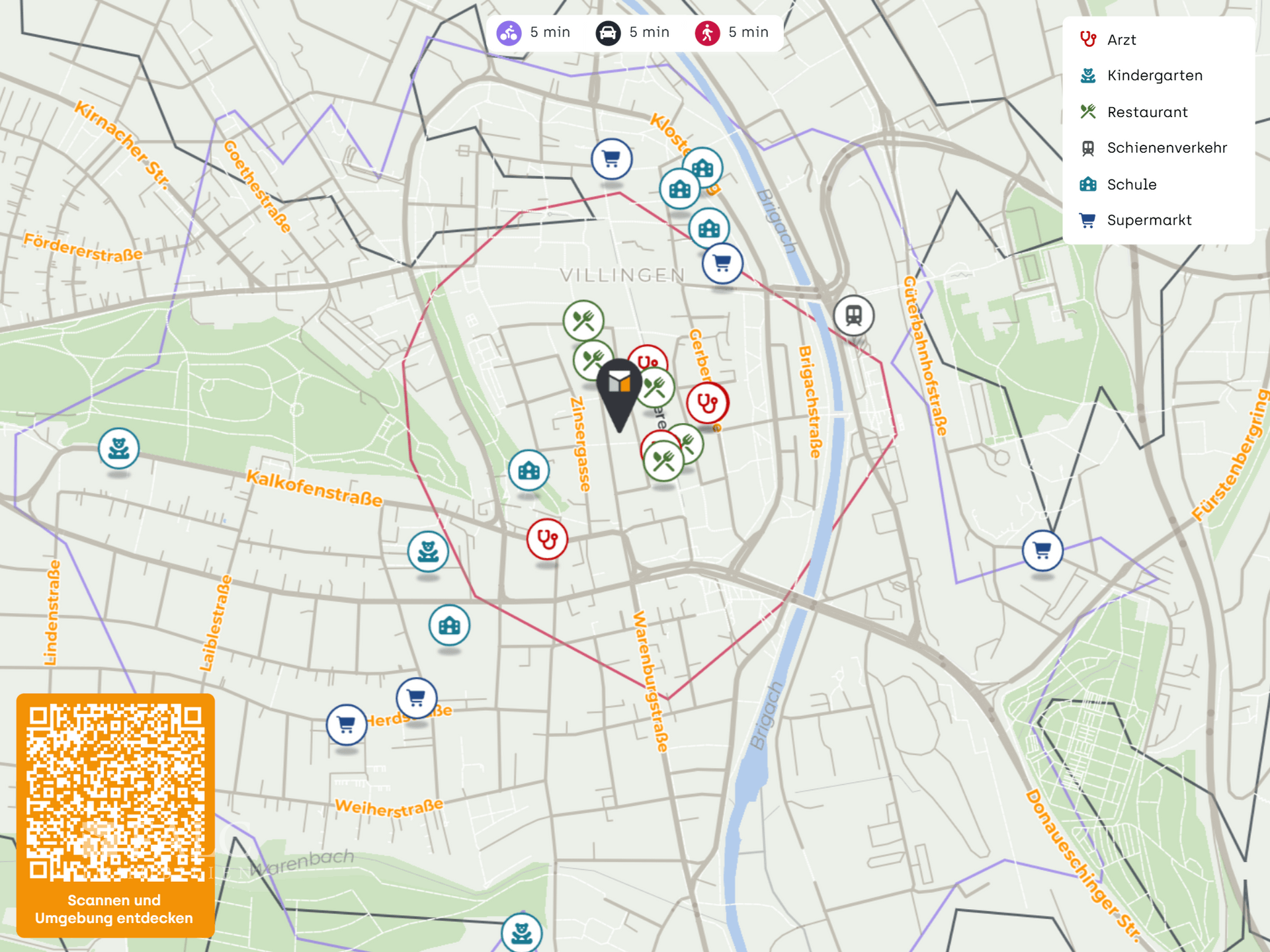 Kurze Wege zum Bahnhof Villingen, zur Schwarzwald Apotheke, zum CAP Markt und zum Franziskanermuseum stärken die Lagequalität und sprechen unterschiedliche Mieterprofile an. Ergänzend stehen Parkhäuser und Parkmöglichkeiten in der Nähe zur Verfügung, was die Vermietbarkeit im innerstädtischen Kontext zusätzlich unterstützt.