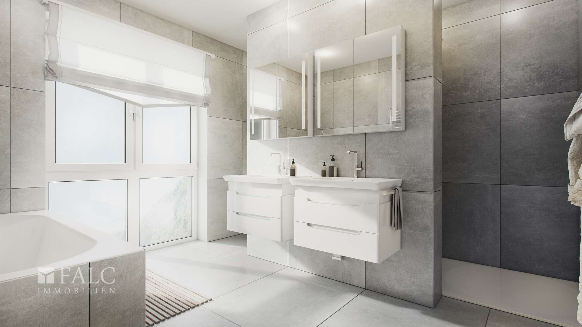 Das Tageslichtbad ist hochwertig ausgestattet mit einer bodengleichen Dusche mit Glasabtrennung, einer Badewanne, einem Waschtisch mit Unterschrank sowie einem WC von Villeroy & Boch. Edle Armaturen von Grohe unterstreichen den gehobenen Anspruch. Die komplette Badausstattung ist im Miet-/Kaufpreis enthalten.