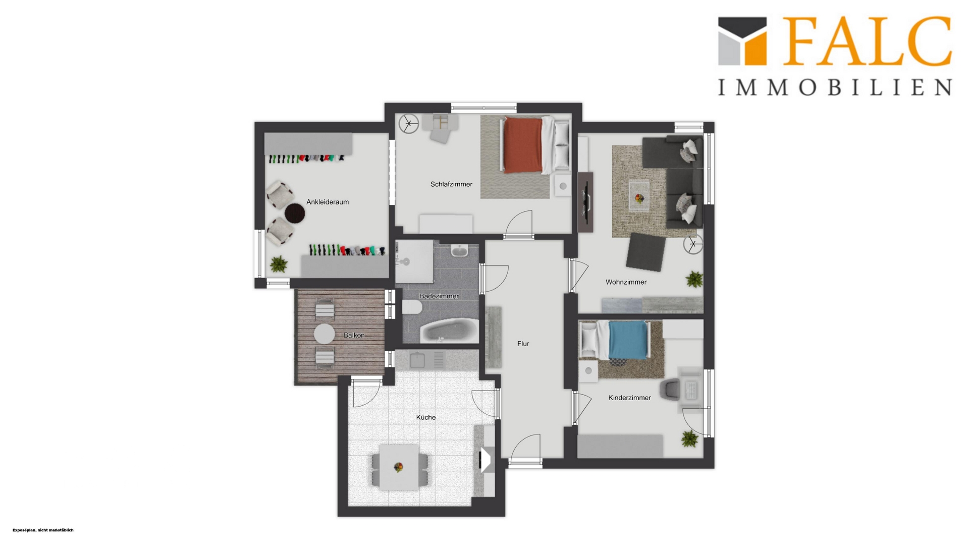 - Grundriss mit Wohnzimmer, Schlafzimmer, Kinderzimmer, Küche, Badezimmer, Flur und Ankleideraum