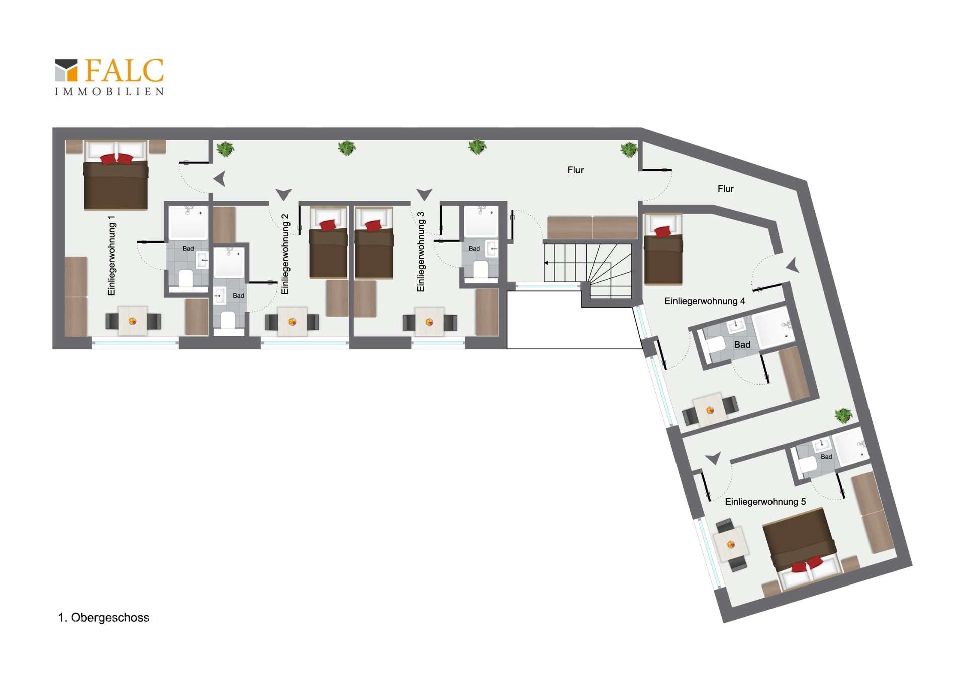 -Gute Raumaufteilung mit 5 Einraumwohnungen und eigenem Bad im OG