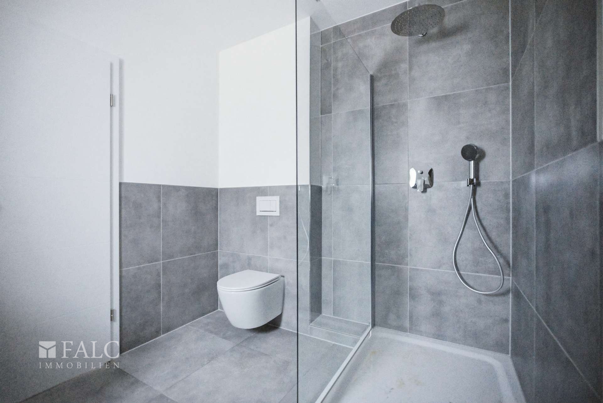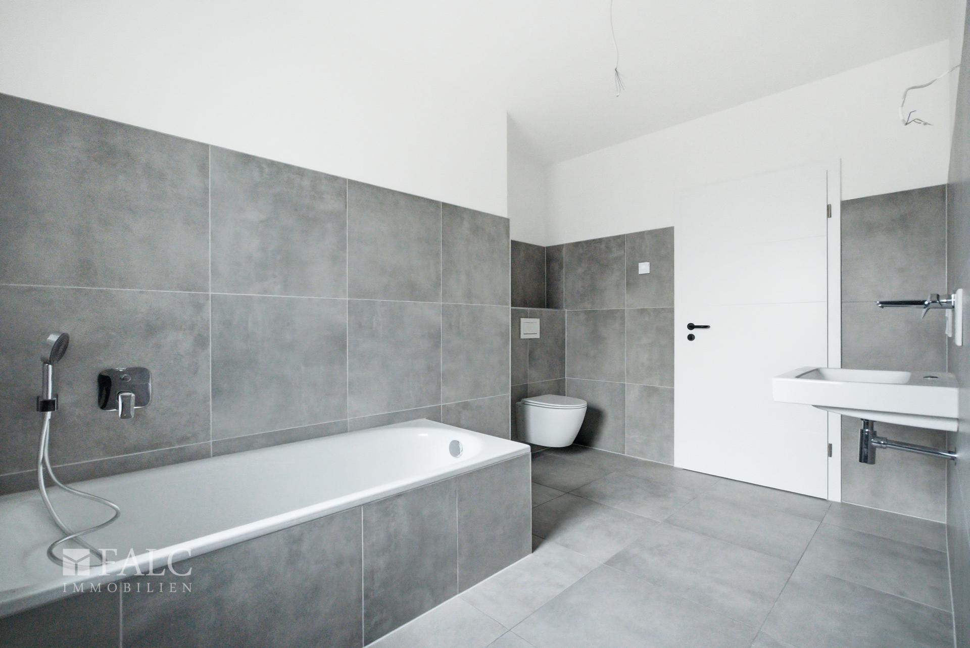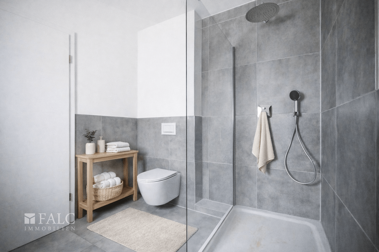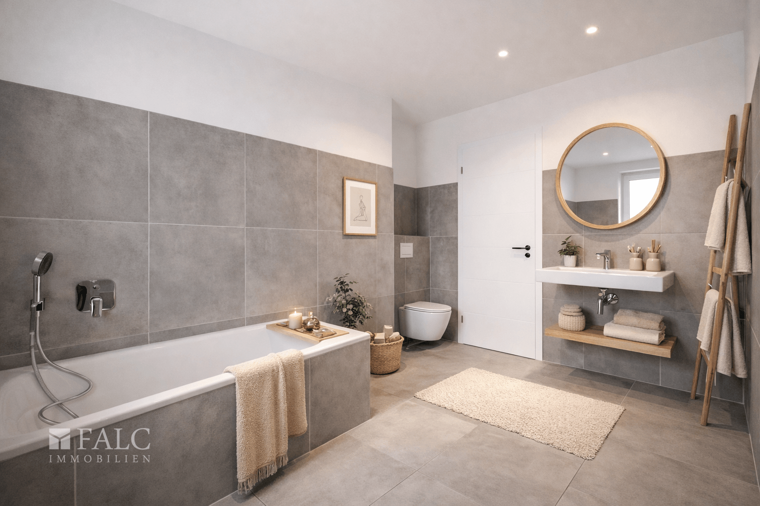 Die beiden Badezimmer sind elegant ausgestattet mit großformatigen 60×60 cm Fliesen, einer bodentiefen Dusche, einer übergroßen Badewanne und werden durch hochwertige Materialien sowie eine durchdachte Lichtplanung mit LED-Spots ergänzt. Der Waschmaschinenanschluss befindet sich ebenfalls im Badezimmer und sorgt so für zusätzlichen Wohnkomfort.