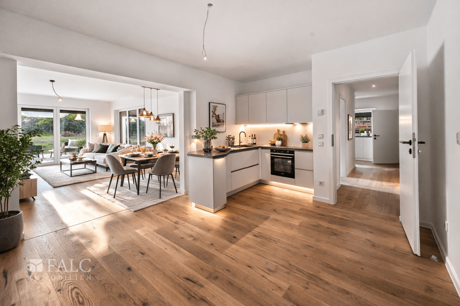 Die besonderen Highlights dieser Wohnung sind der beeindruckende Wohn- Essbereich mit ca. 38,66 m², sowie der ca. 350m² Garten zur alleinigen Nutzung mit Südwest-Ausrichtung. Dieser bietet weitläufigen Platz für eine hochwertige Lounge, Pflanzenarrangements oder gemütliche Abendessen im Freien – und verspricht sonnige Stunden sowie traumhafte Sonnenuntergänge.