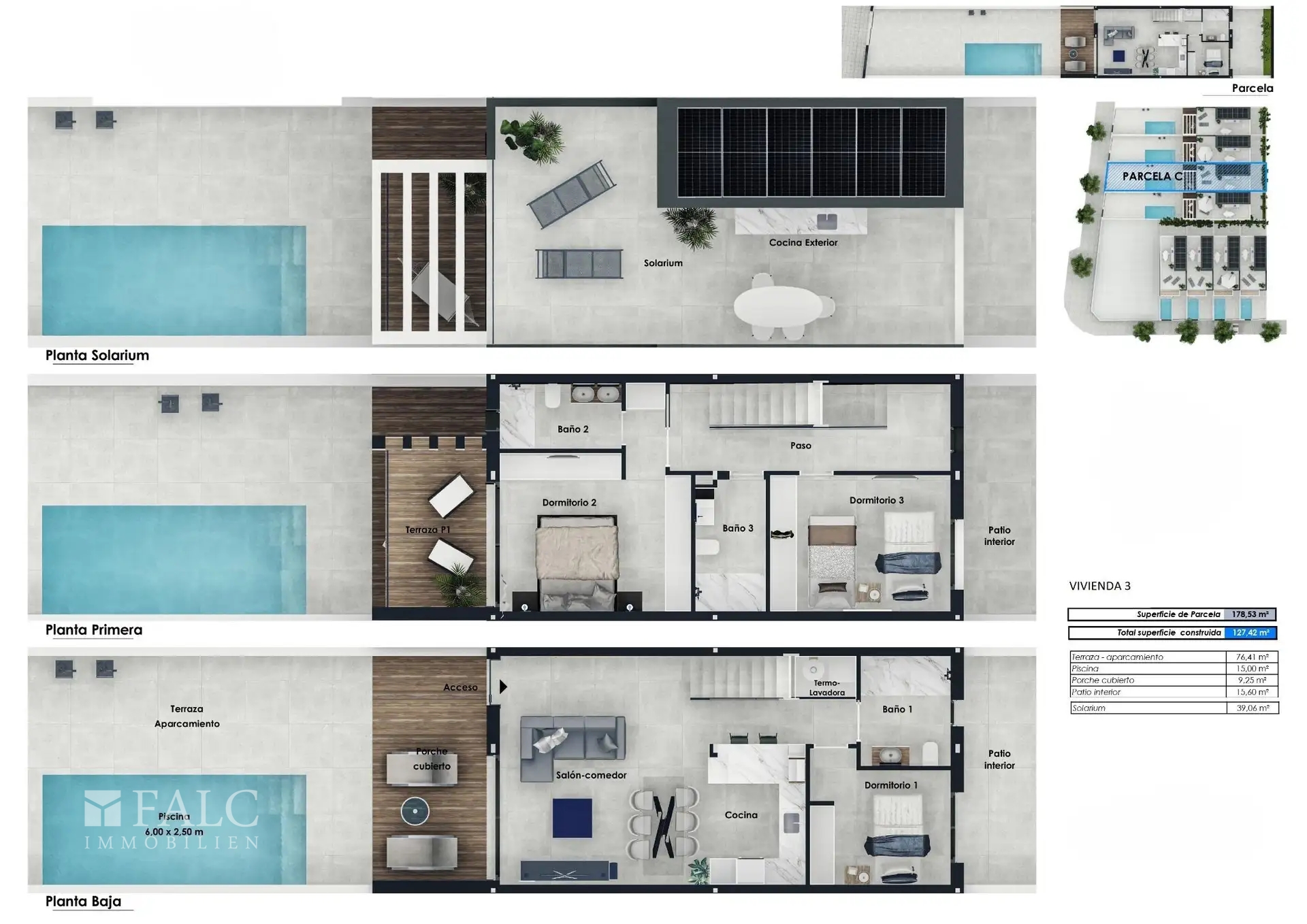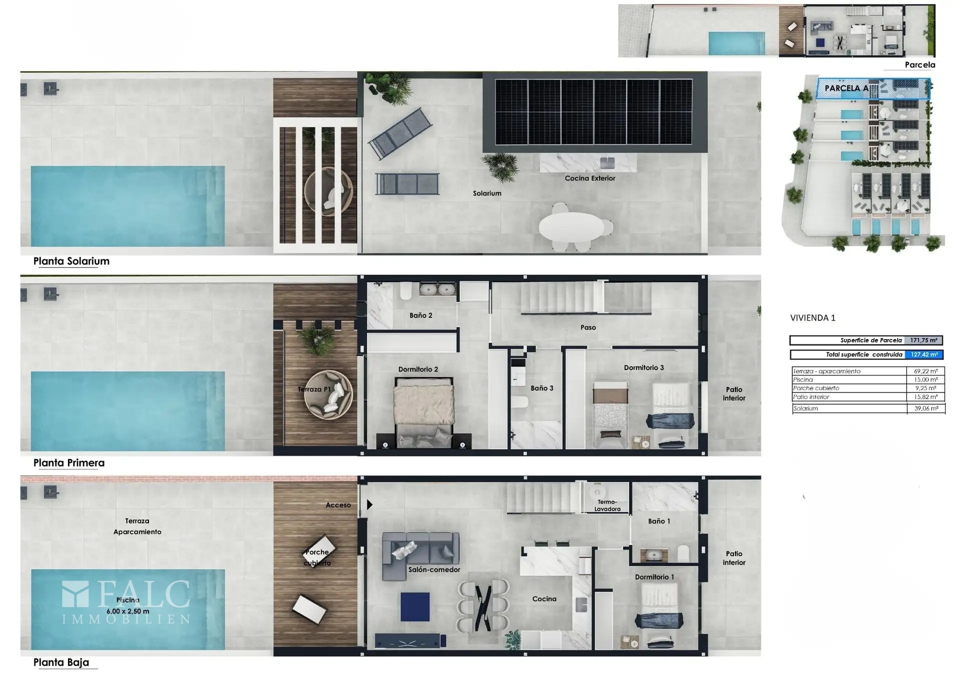 Die Häuser erstrecken sich über zwei Ebenen plus Dachsolarium und bieten: