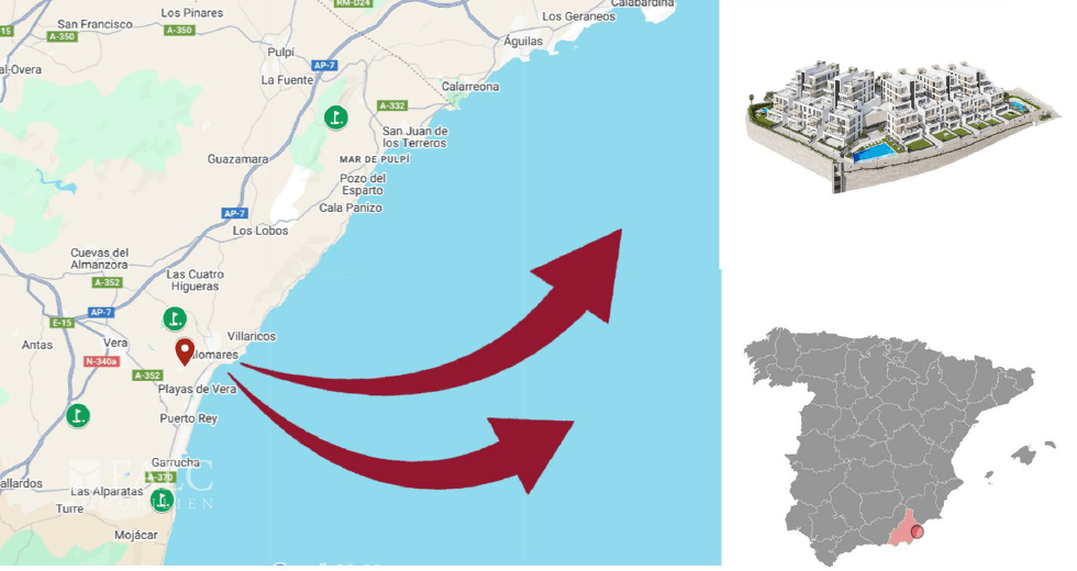 Vera liegt strategisch günstig mit schneller Anbindung an benachbarte Orte wie Garrucha, Mojácar, Cuevas del Almanzora und ist über die Autobahn A-7 sowie den Flughafen Almería (ca. 1 Stunde) gut erreichbar. Auch der internationale Flughafen von Murcia ist nur etwa 1,5 Stunden entfernt – ideal für internationale Käufer oder Pendler.