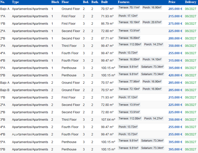 | Bajo A | Apartment | 2 | Erdgeschoss | 2 | 2 | 70,57 m² | Terrasse: 77,96 m², Veranda: 16,90 m² | 285.000 € |