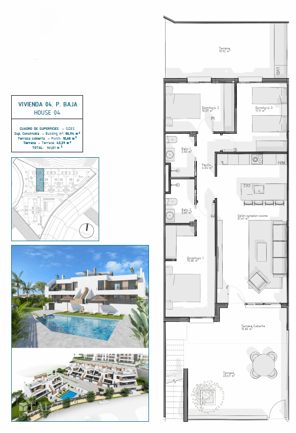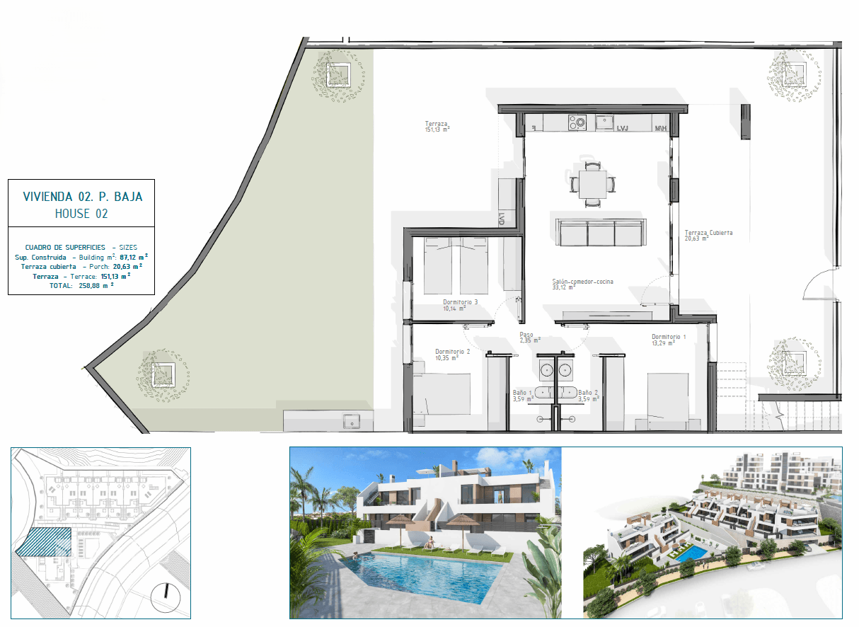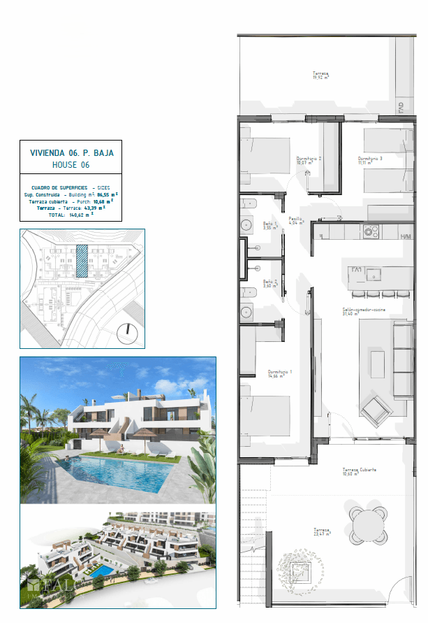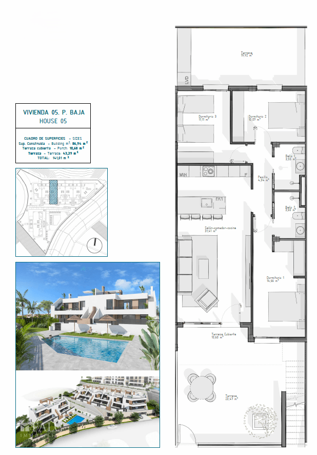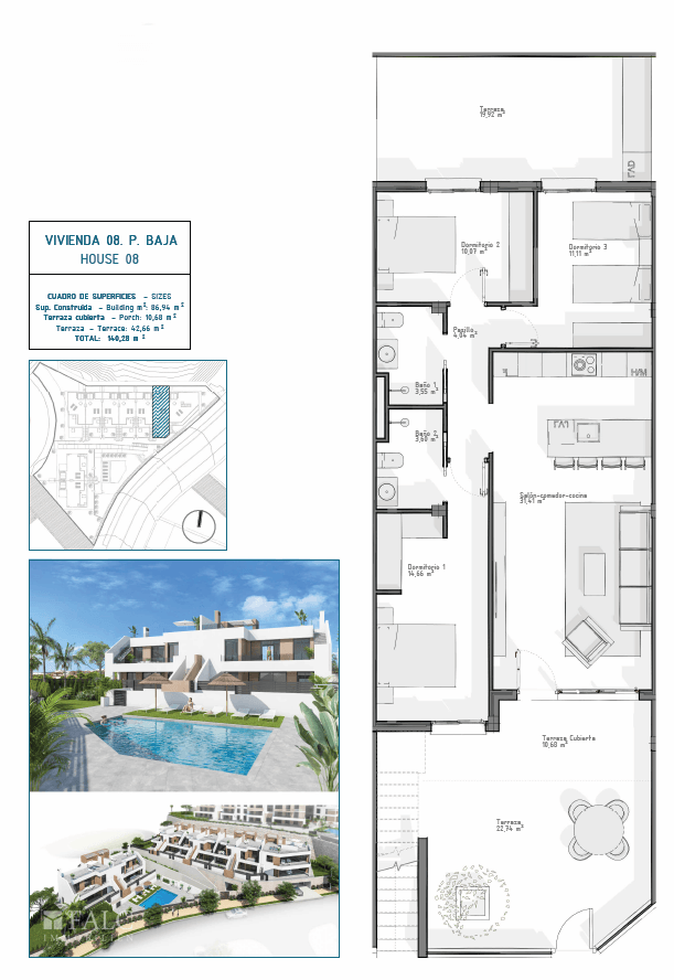 In Vera Playa (Almería) entsteht eine exklusive Wohnanlage mit 18 modernen Maisonetten/Bungalows, die höchsten Wohnkomfort und mediterranes Lebensgefühl vereinen. Die Wohnungen bieten 2 oder 3 Schlafzimmer, 2 komplette Badezimmer sowie großzügige Terrassen im Erdgeschoss oder private Dachterrassen mit Sommerküche in den Obergeschossen.