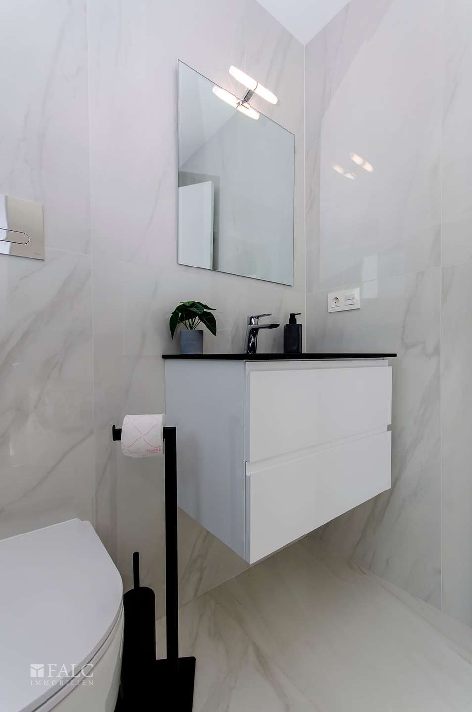 Die Villa verfügt über eine moderne Einbauküche mit hochwertigen Ober- und Unterschränken, einer eleganten Quarzarbeitsplatte sowie Vorinstallationen für alle gängigen Elektrogeräte. Die Schlafzimmer sind mit Einbauschränken ausgestattet und bieten Rückzugsmöglichkeiten mit hohem Wohnkomfort. Die Badezimmer präsentieren sich zeitgemäß mit hochwertigen Sanitärobjekten, Möbeln, Spiegeln, Beleuchtung sowie Fußbodenheizung – im Hauptbad zusätzlich mit Hydromassage-Duschsäule.