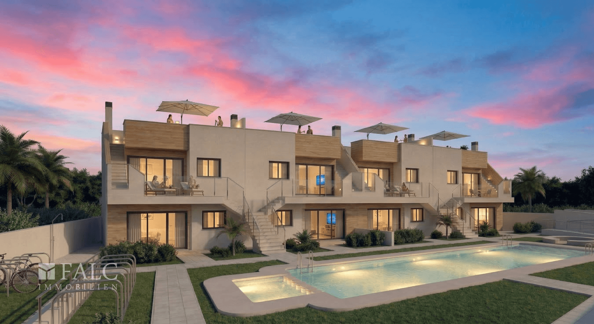 Die Außenbereiche bieten viel Privatsphäre und laden dazu ein, das mediterrane Klima in vollen Zügen zu genießen – ob beim Sonnenbaden, bei einem Abendessen im Freien oder beim Entspannen am Pool. Viele der Villen verfügen über einen eigenen Swimmingpool, eine Dachterrasse sowie einen Stellplatz auf dem Grundstück.