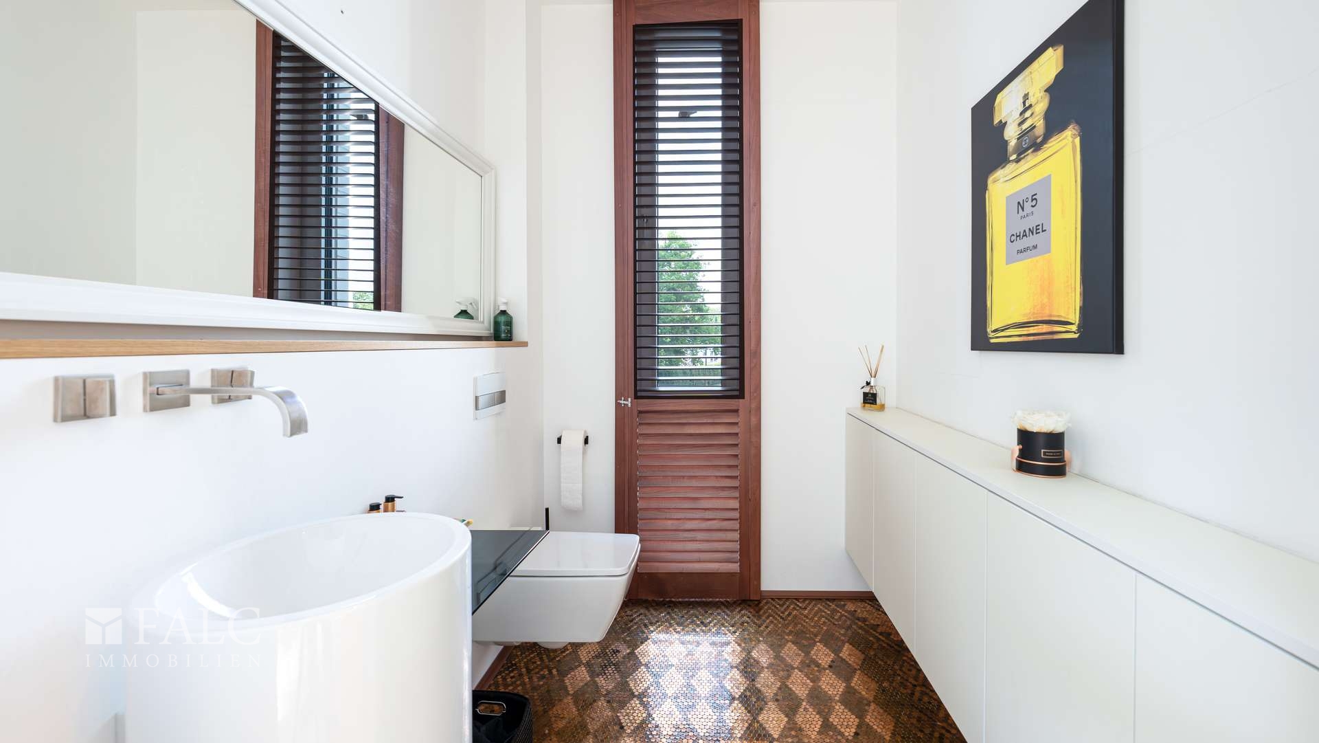 Im Obergeschoss erwarten Sie repräsentative Schlafzimmer mit hochwertigen Einbauten, en-suite-Bädern und Zugang zu einem umlaufenden Balkon. Das luxuriöse Masterbad überzeugt mit edlen Materialien, freistehender Badewanne und bodentiefer Dampfsauna. Ein separates Gäste-WC steht im Erdgeschoss zur Verfügung. Die durchdachte Raumaufteilung schafft Privatsphäre und Wohnkomfort auf höchstem Niveau.