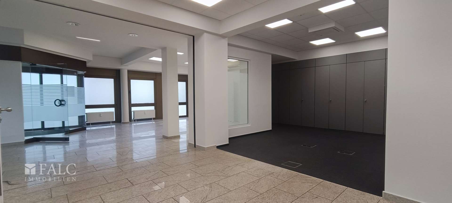 Links befindet sich der erste Büroraum, ideal für konzentriertes Arbeiten. Durch die großen Fenster ist eine angenehme Arbeitsumgebung gegeben. Weiter geht es in den zweiten Büroraum, der ebenfalls gut belichtet ist und Platz für Arbeitsplätze bietet.