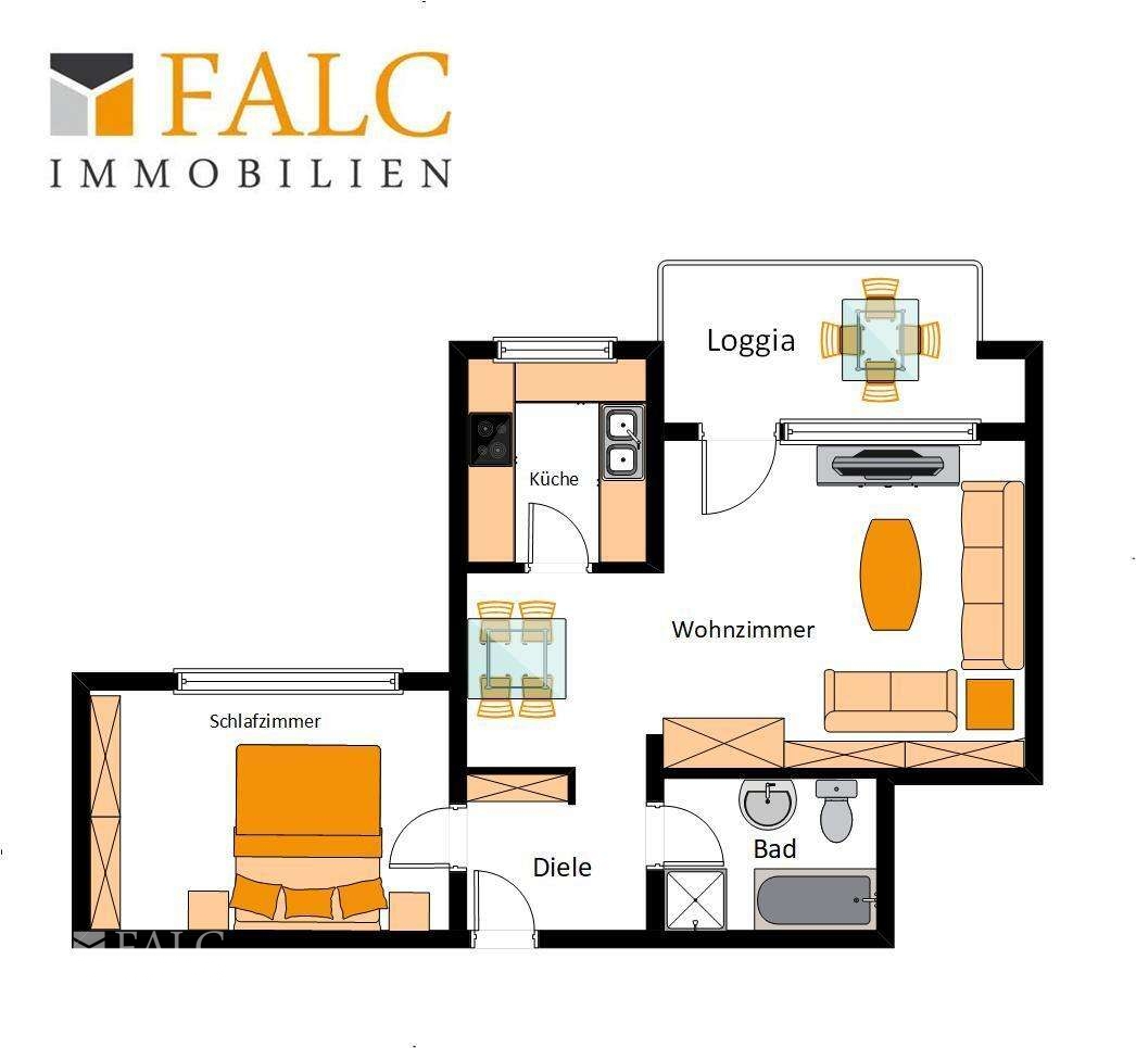 • Zimmer: 2 (Wohnzimmer, Schlafzimmer, Küche, Bad, Flur)