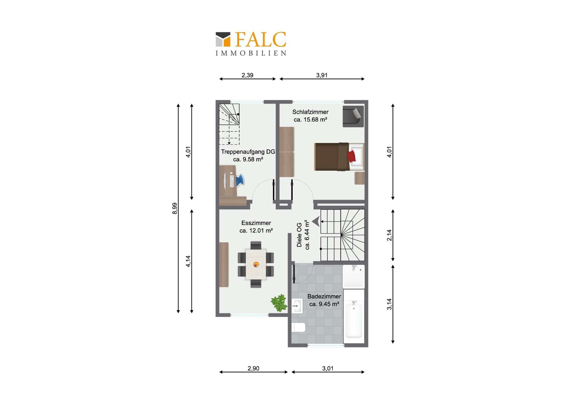 Im Obergeschoss befinden sich das Schlafzimmer, ein Kinderzimmer sowie das großzügige Tageslichtbad, ausgestattet mit Dusche und Badewanne – eine Oase der Ruhe und Erholung. Darüber hinaus befindet sich auf dieser Etage ein weiteres Zimmer, das aktuell als Büro genutzt wird und gleichzeitig den Zugang zum Dachgeschoss eröffnet.