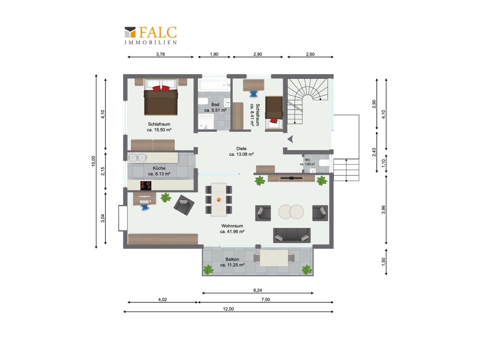 - Erdgeschoss (93,65 m² Wohnfläche): 3 Zimmer + Küche, Diele, Badezimmer, Gäste-WC und Balkon