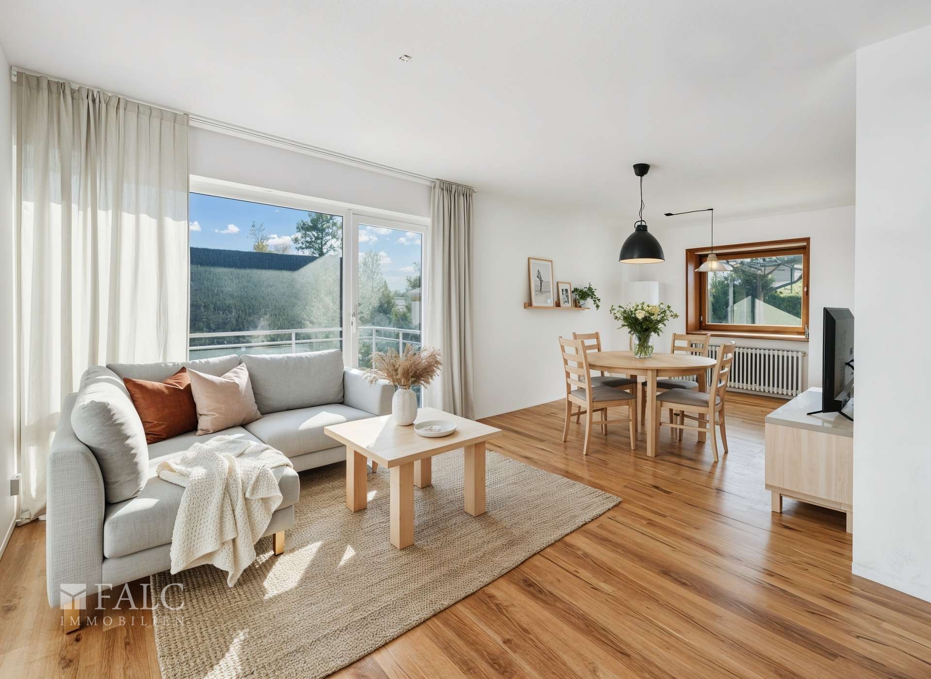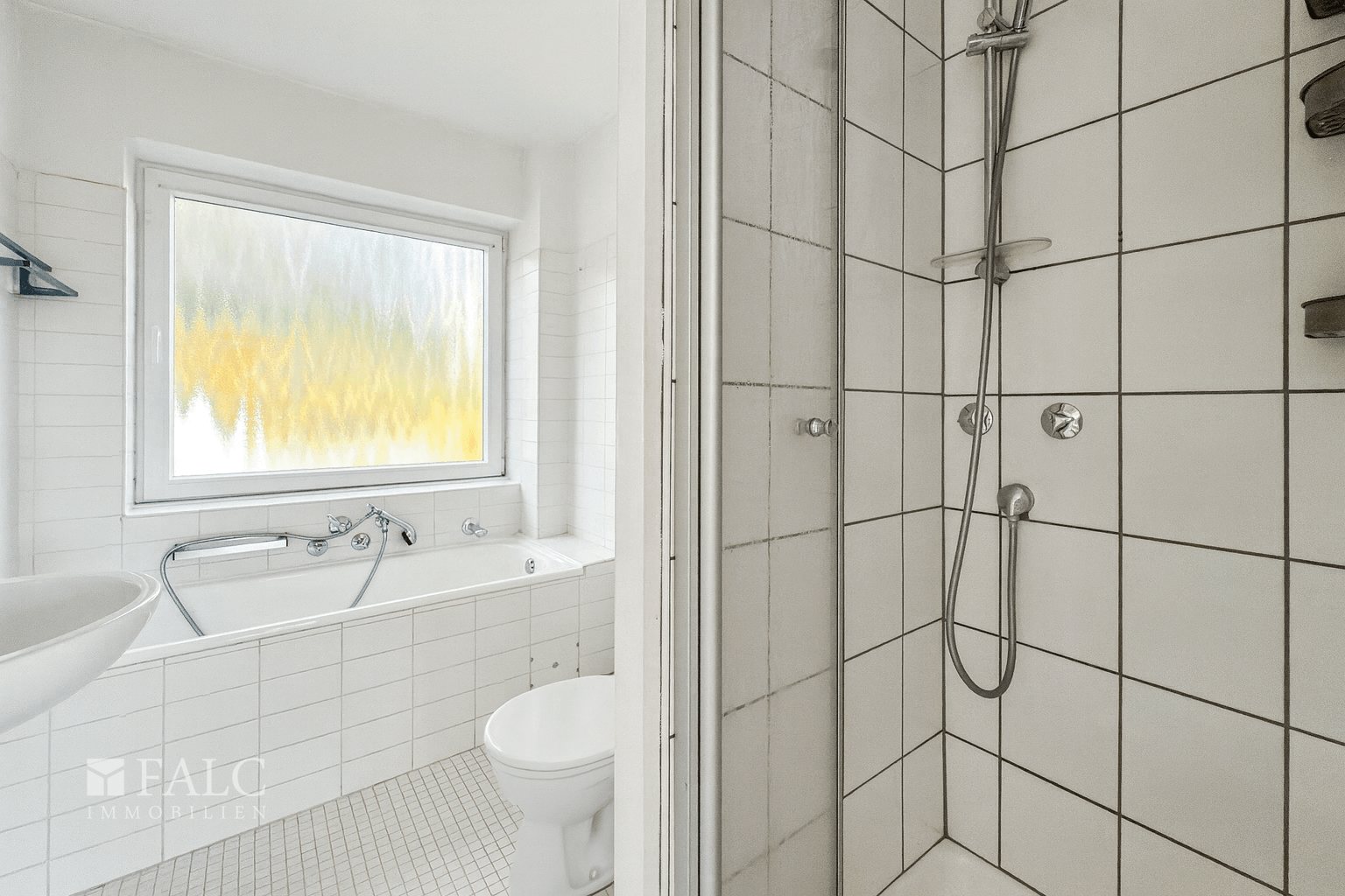 Im Erdgeschoss (Hochparterre) befindet sich eine freundliche, helle Wohnung mit einer Wohnfläche von ca. 93,65 m². Der großzügige Wohn- und Essbereich öffnet sich zum Balkon und sorgt mit großen Fenstern für viel Licht und eine angenehme Wohnatmosphäre. Eine gemütliche Küche, ein Schlafzimmer, ein Tageslichtbad mit Dusche und Badewanne, ein weiteres Zimmer – ideal als Büro oder Gästezimmer – sowie ein separates WC vervollständigen diese Etage.