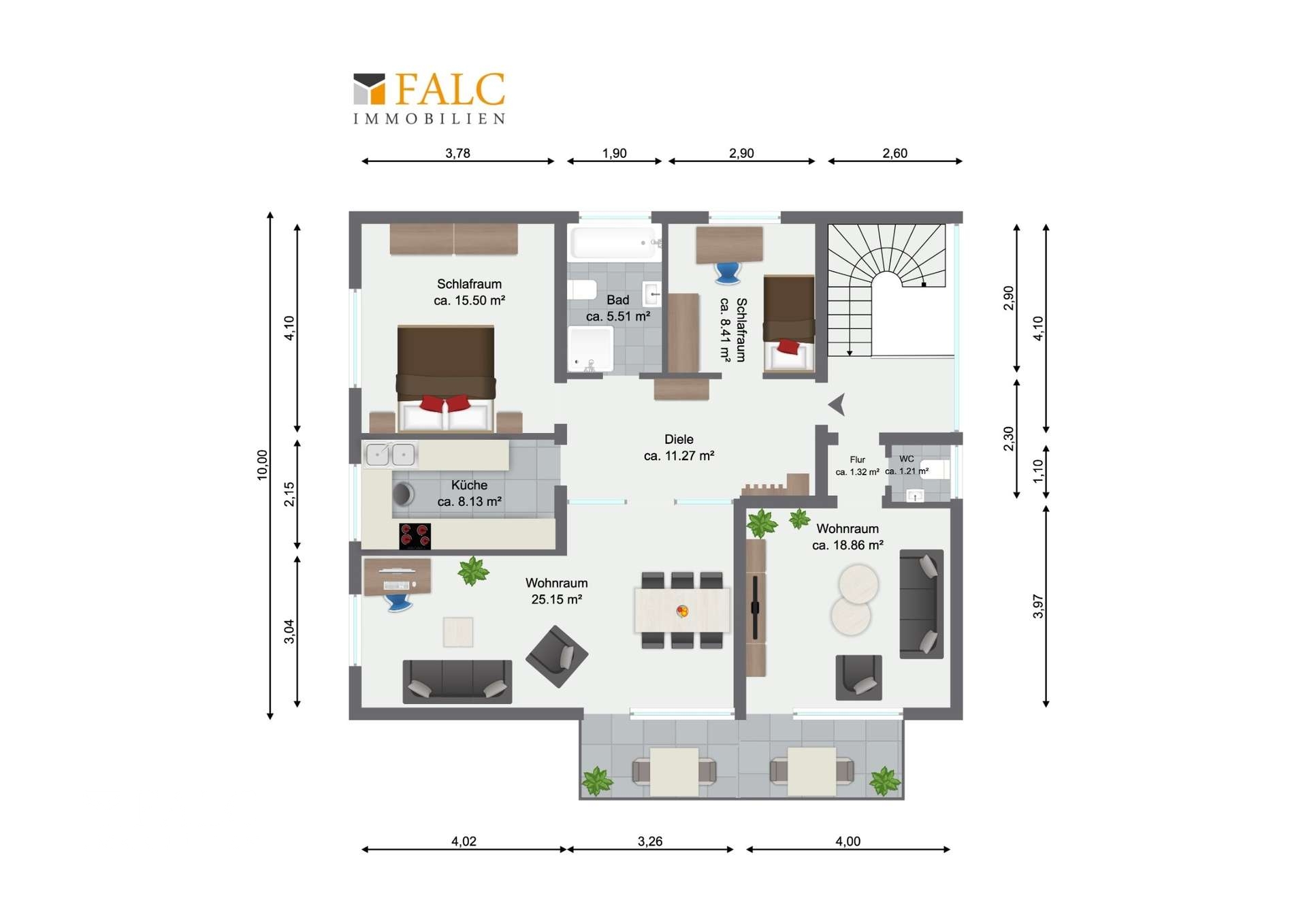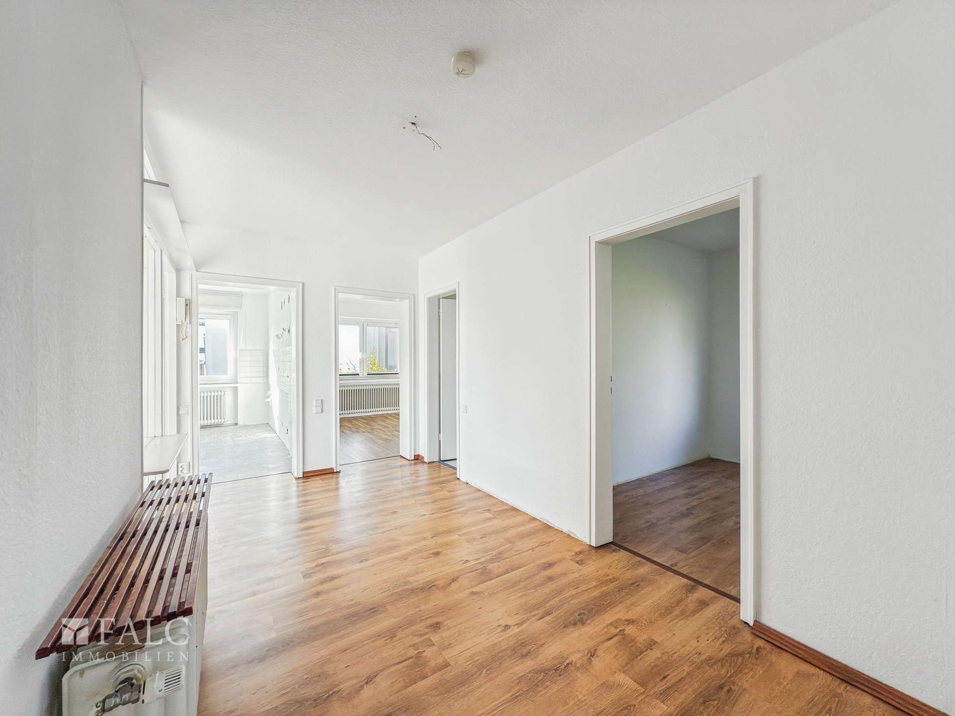 Das Obergeschoss umfasst eine Wohnfläche von ca. 91,88 m² und spiegelt den Grundriss der Erdgeschosswohnung nahezu identisch wider: ebenfalls drei Zimmer, Küche, Diele und ein Tageslichtbad mit Badewanne und Dusche. Durch eine zusätzliche Wand wurde hier ein weiteres Zimmer, beispielsweise als Kinderzimmer, geschaffen – inklusive eigenem WC. Vom Wohnbereich und vom Kinderzimmer aus gelangt man auch hier auf den eigenen Balkon, der zu entspannten Momenten am Tagesende einlädt.