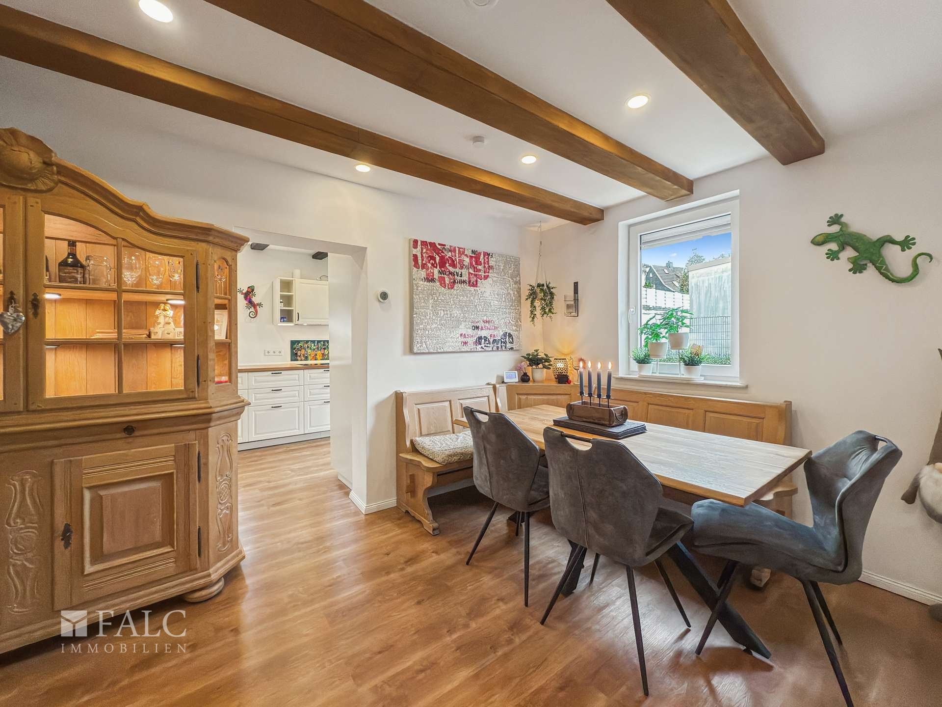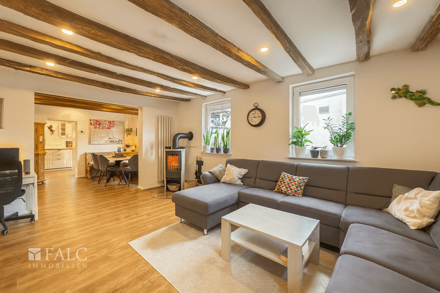 Im Mittelpunkt steht der weitläufige Wohnbereich. Durch seine Offenheit entsteht sofort ein angenehmes Raumgefühl. Der Kamin aus dem Jahr 2024 setzt hier einen besonderen Akzent und schafft eine warme, ruhige Atmosphäre, in der man gerne verweilt. Wohnen und Essen gehen fließend ineinander über und bilden einen offenen Bereich für gemeinsames Leben, Kochen und Zusammensein.