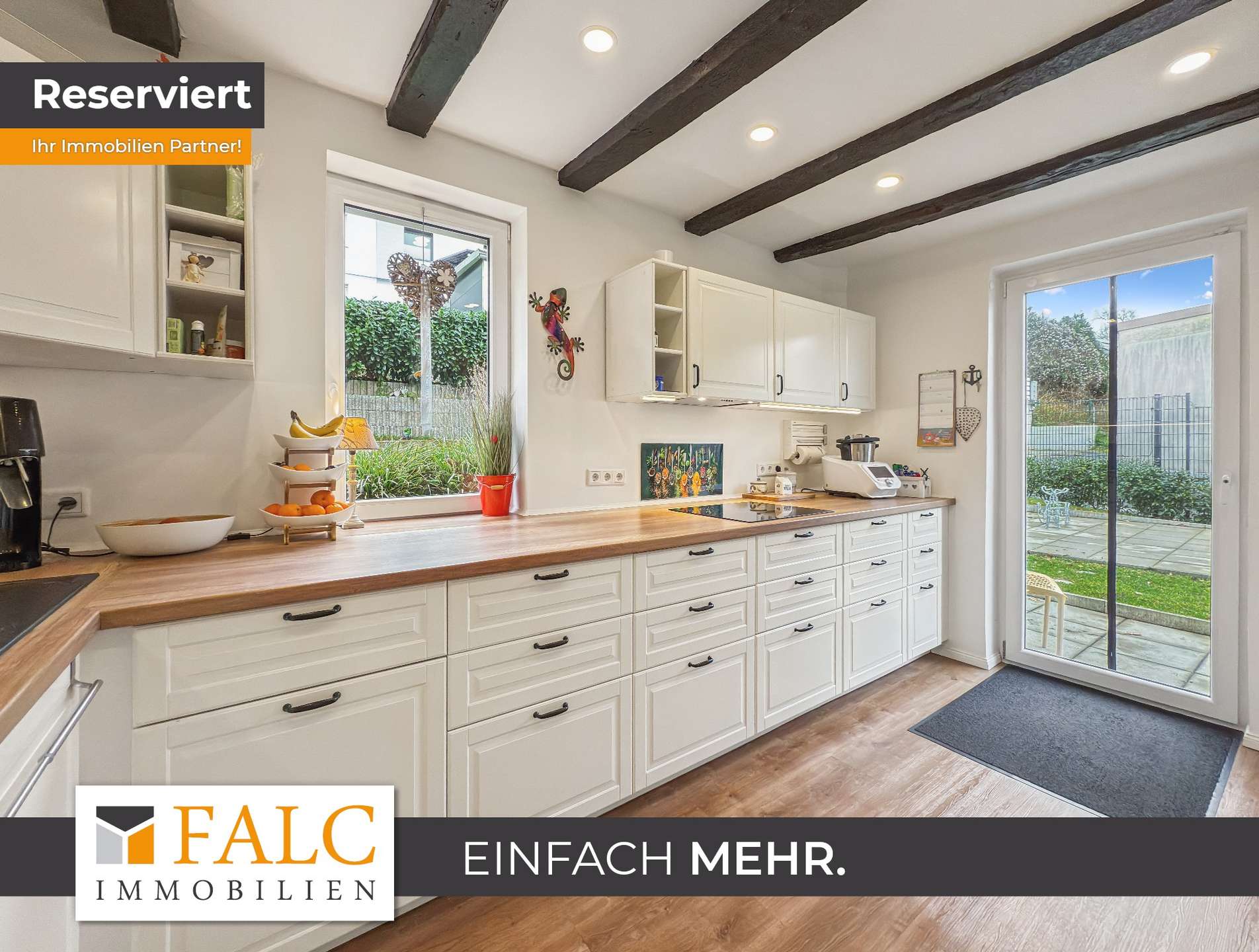 Die moderne, großzügig gestaltete Küche ist harmonisch in diesen Wohn-/ Essbereich eingebunden und überzeugt durch kurze Wege im Alltag. Von hier öffnet sich der Zugang zur Terrasse und in den Garten, wodurch sich der Wohnraum in den warmen Monaten ganz selbstverständlich nach draußen erweitert. Ideal für Mahlzeiten im Freien, entspannte Stunden oder um Kinder beim Spielen im Blick zu behalten.