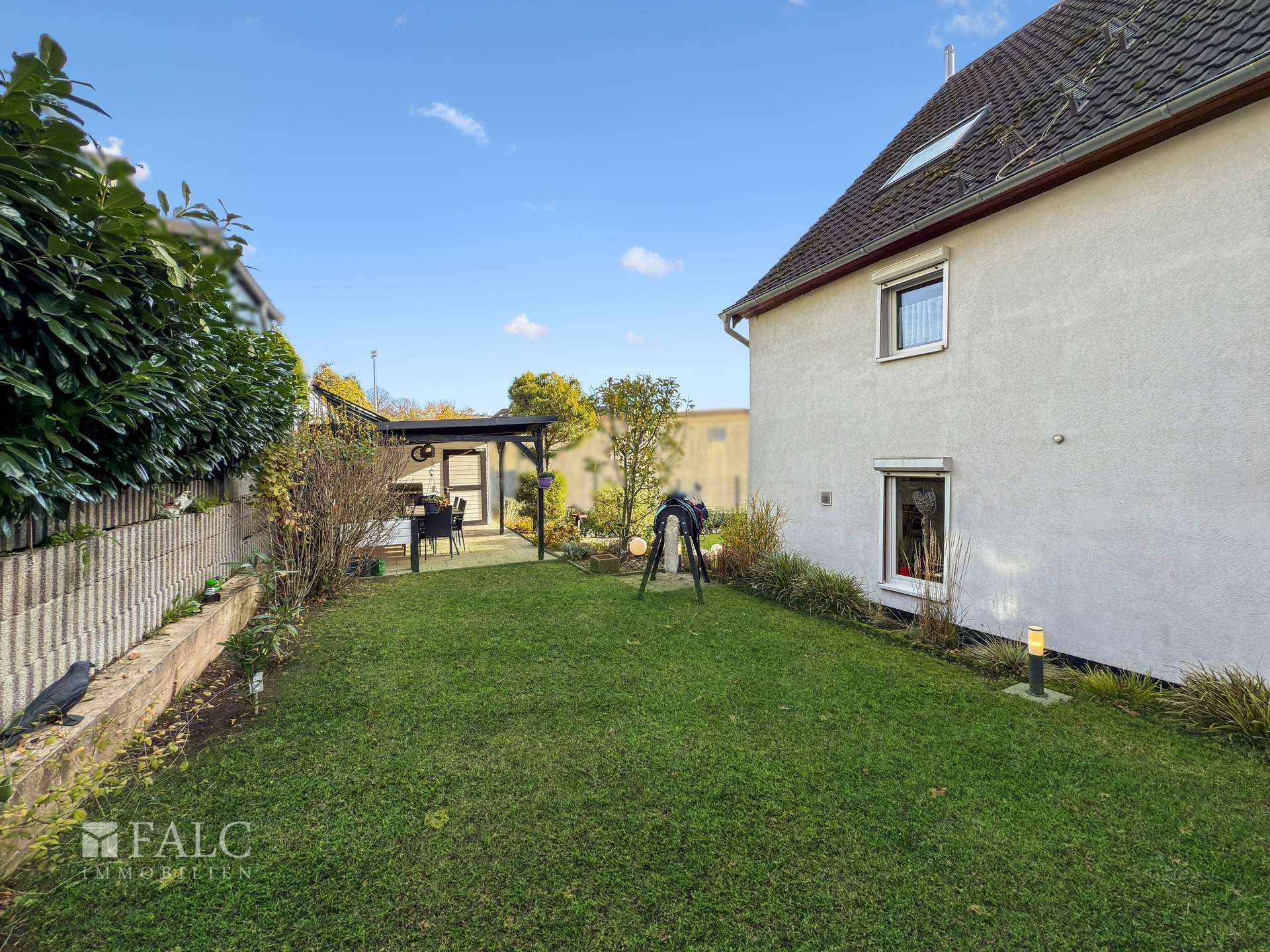 Der Außenbereich bildet einen echten Mehrwert. Die großzügige Gartenfläche in Nord-Ost-Ausrichtung eignet sich hervorragend als Spielfläche für Kinder und bietet zugleich Raum für Gartenliebhaber. Ob Gemüsebeet, Blumen oder eine grüne Rückzugsoase, hier lassen sich viele Ideen verwirklichen. Eine überdachte Terrasse sowie eine zusätzlich offene Terrassenfläche schaffen unterschiedliche Plätze für sonnige Nachmittage, ruhige Pausen oder gesellige Grillabende.