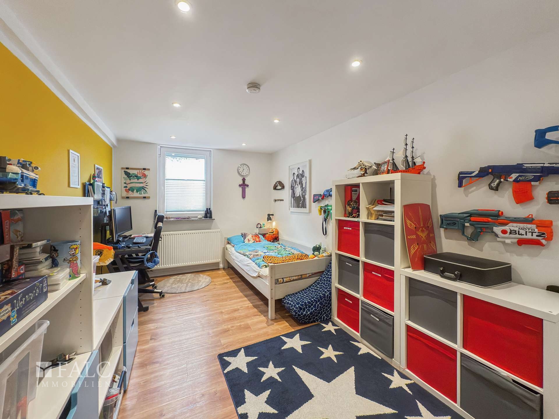 Zwei große Kinderzimmer bieten viel Platz zum Spielen, Lernen und Wachsen. Das Schlafzimmer ist angenehm ruhig gelegen und bietet mit seiner Größe genug Platz für eine erholsame Schlafzone und individuelle Gestaltungsideen. Ein kleiner Abstellraum, aktuell als begehbarer Kleiderschrank genutzt, schafft praktischen Stauraum.