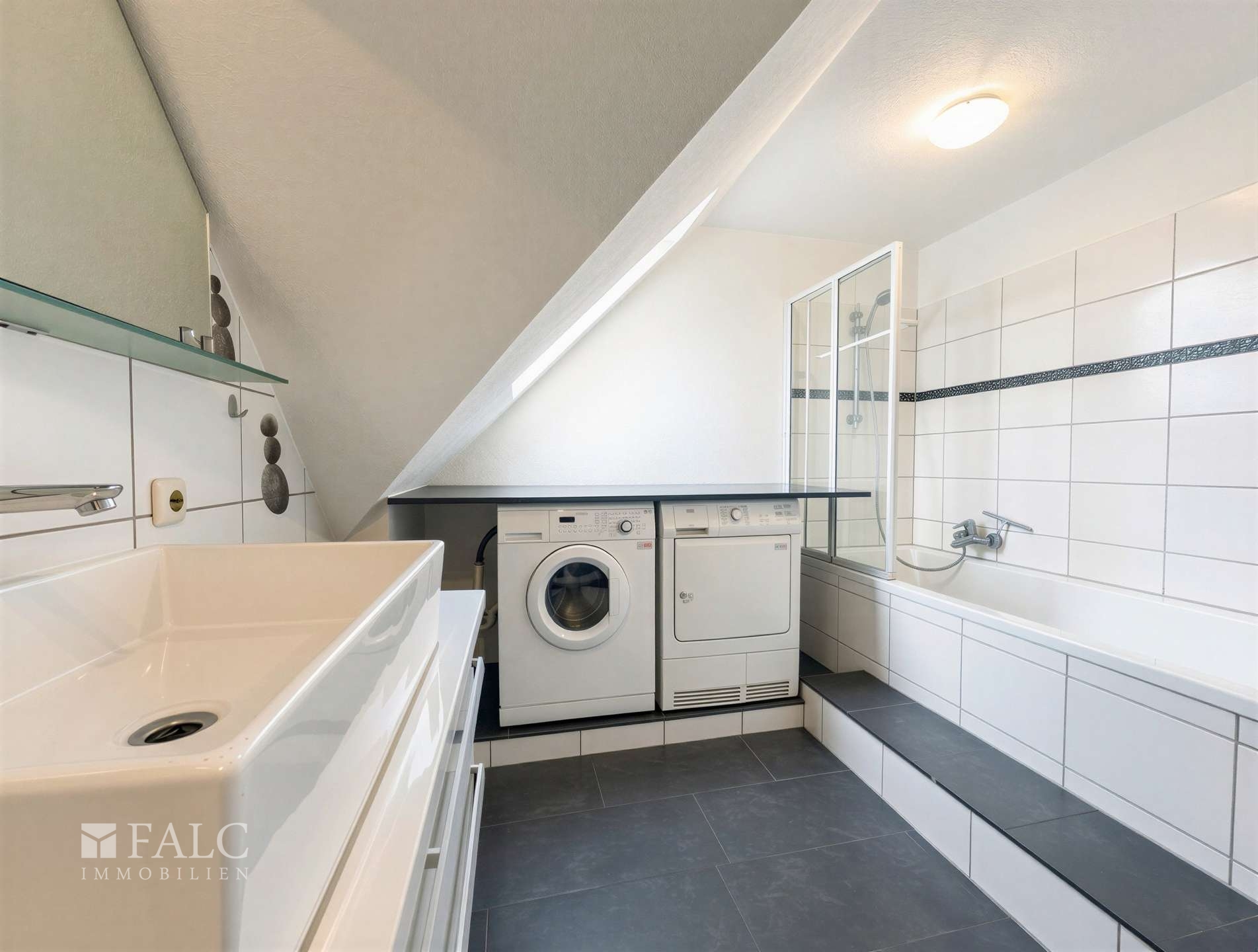 - Badezimmer: mit Duschwanne und Waschmaschinenanschluss