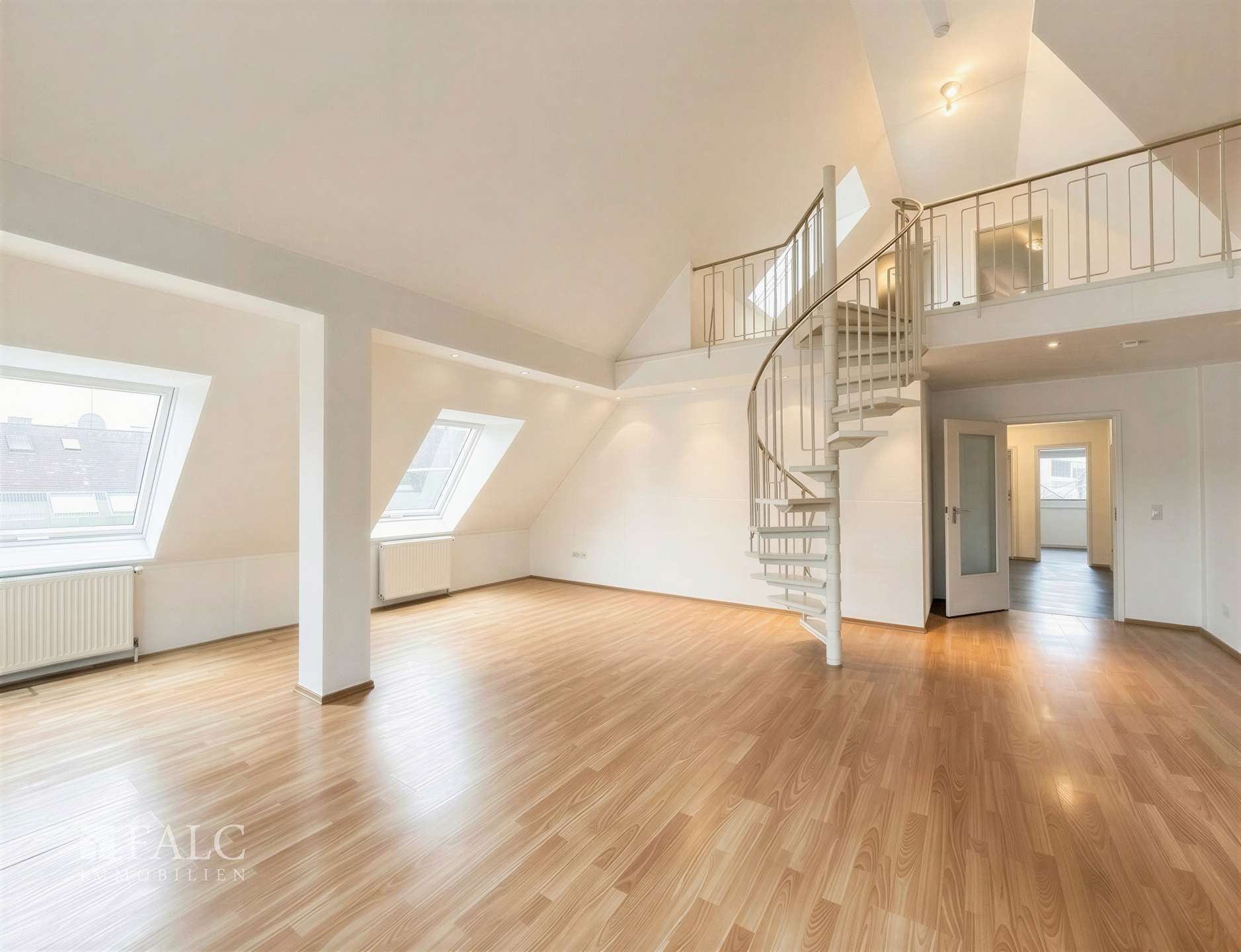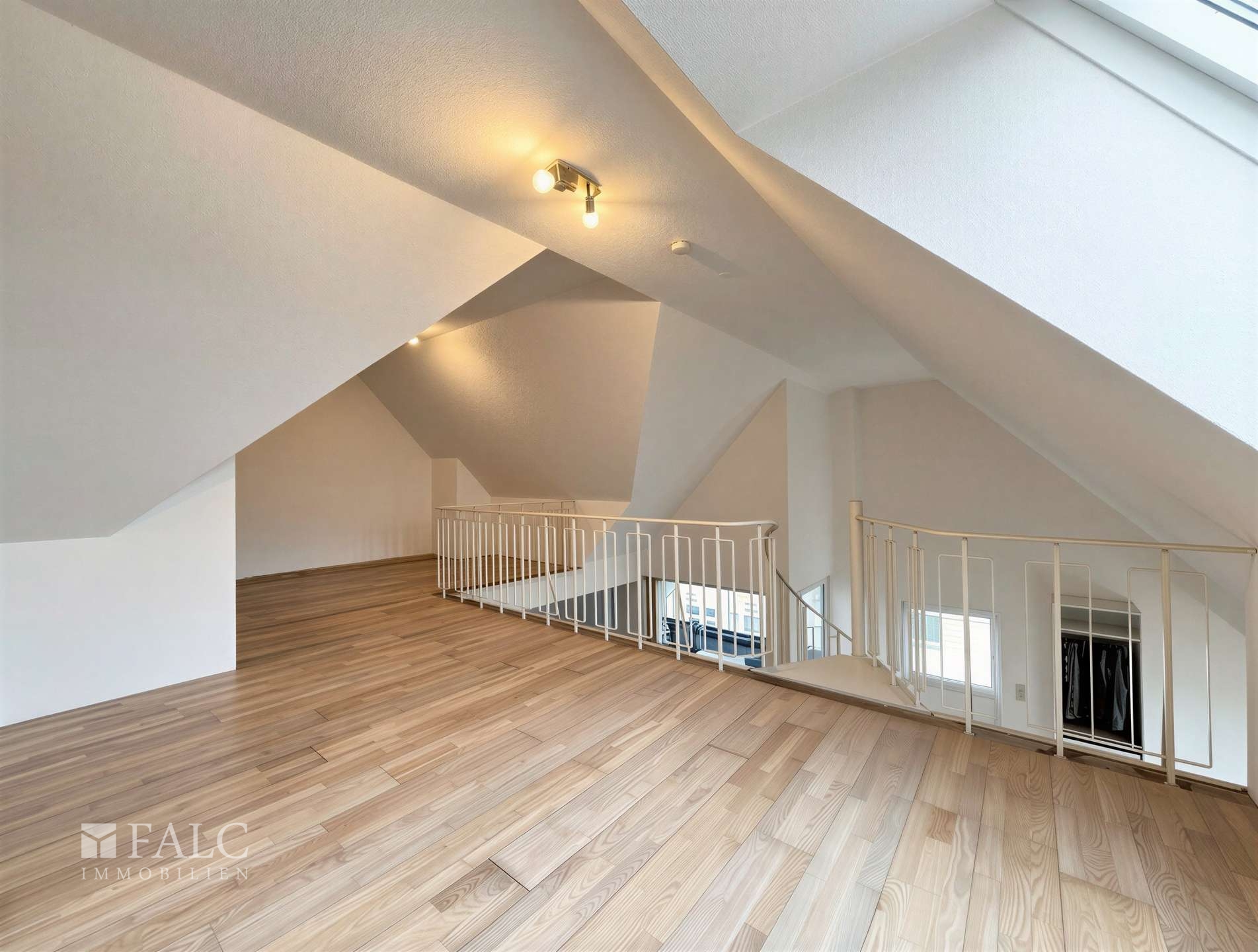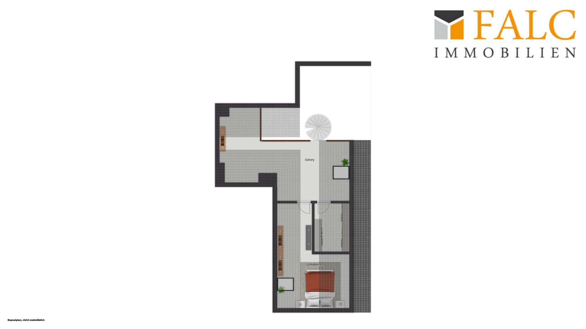 Eine Wendeltreppe führt vom Wohnbereich hinauf zur offenen Galerie. Sie verbindet die Ebenen auf harmonische Weise und setzt einen architektonischen Akzent, der dieser Wohnung ihren besonderen Charakter verleiht. Die Dachgeschossebene dient als Nutzfläche und ist ideal als Hobbyraum, Arbeitsbereich oder Rückzugsort für kreative Tätigkeiten geeignet. Ein eigenständiger, abgeschlossener Raum bietet hier zusätzliche Nutzungsmöglichkeiten. Ergänzt wird dieser Bereich durch einen angrenzenden Abstellraum, der sich hervorragend als Ankleide eignet.