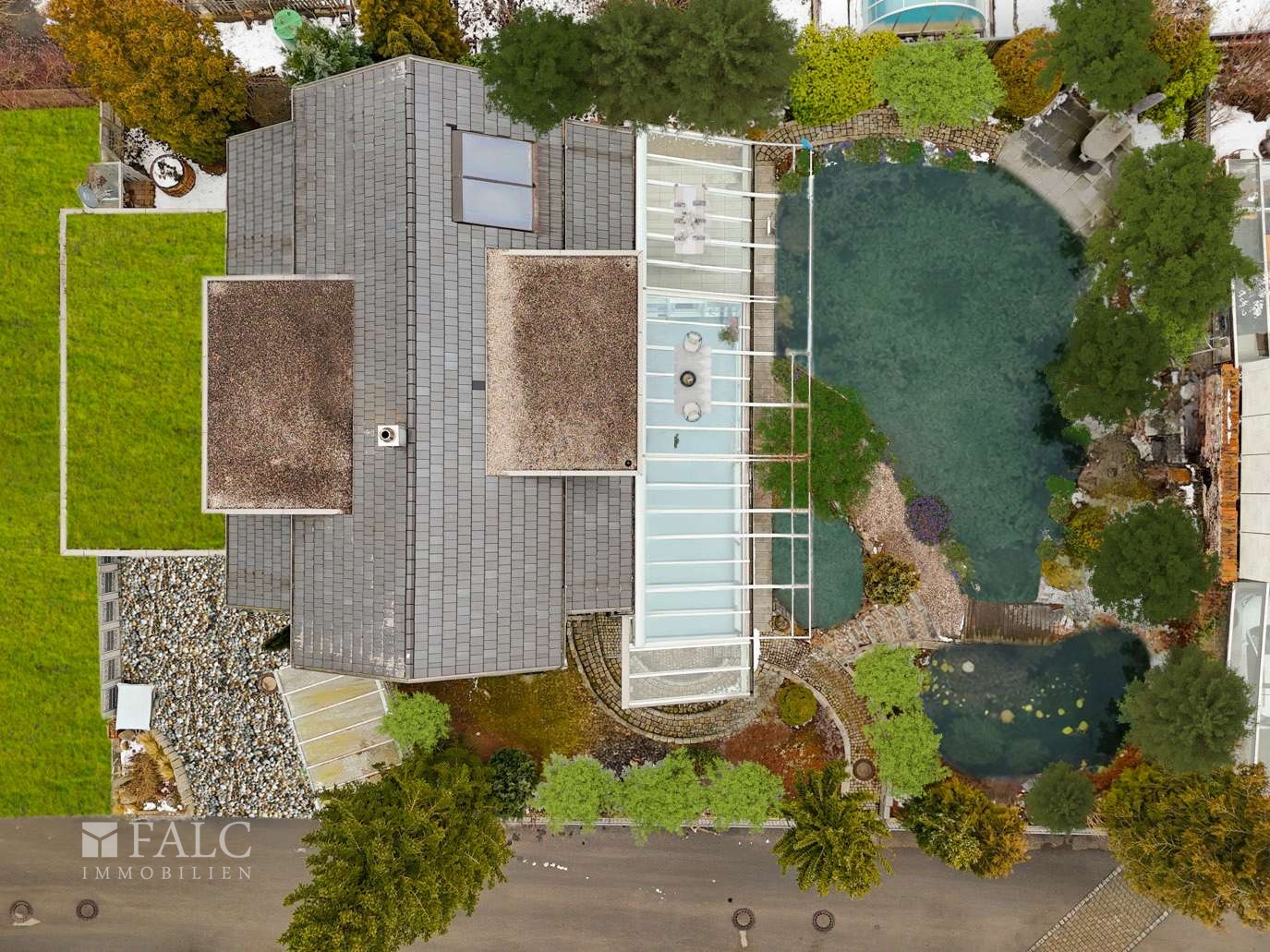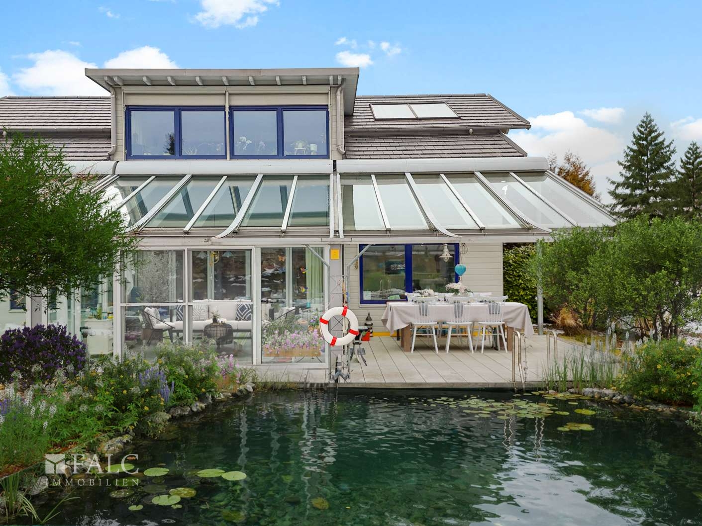 Abgerundet wird das Gesamtbild durch die überdachte Terrasse im Erdgeschoss mit Schwimmteich und den eingewachsenen Garten, die dem Haus eine ruhige, private Außenqualität geben.